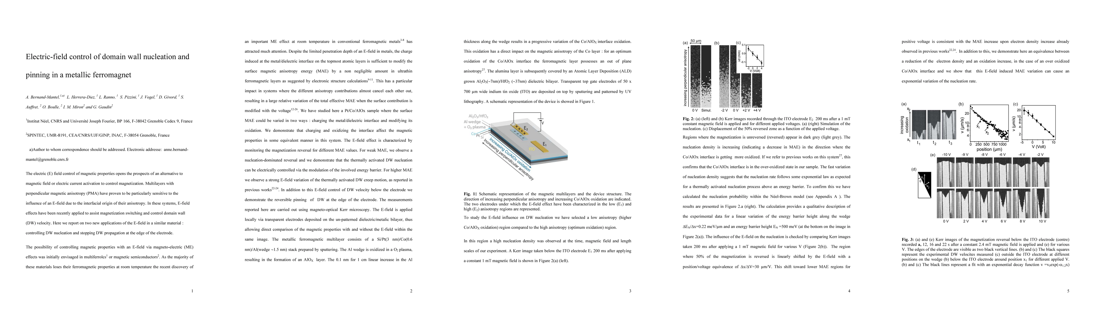 This paper investigates the electric field's ability to control domain wall nucleation and pinning in metallic ferromagnets with perpendicular magnetic anisotropy, demonstrating potential for E-field-driven magnetization control without magnetic fields or electric currents. The study highlights new applications of E-field effects in assisting magnetization switching and managing domain wall dynamics.