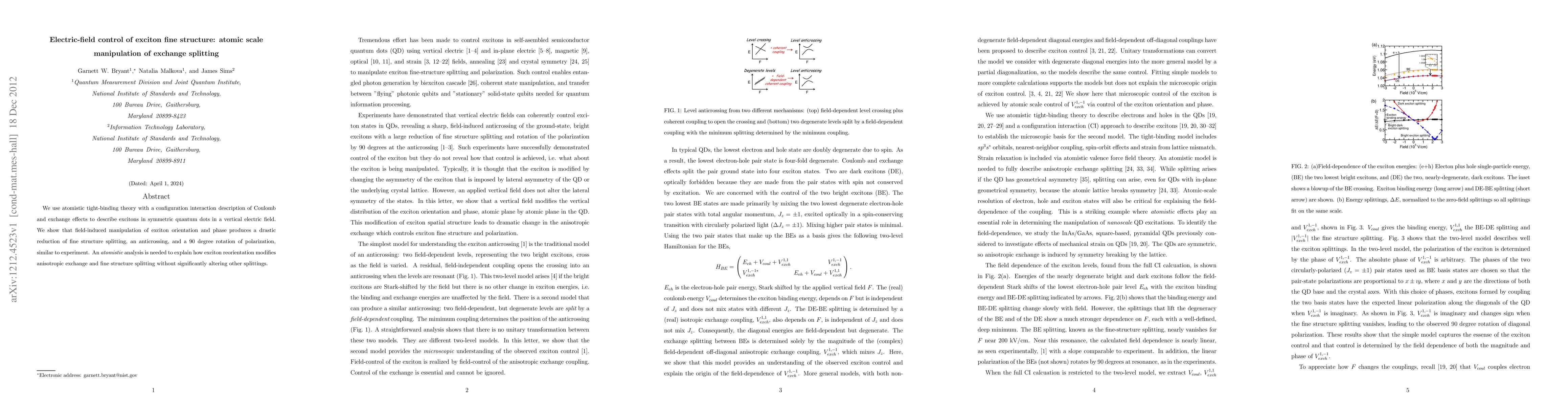 We use atomistic tight-binding theory with a configuration interaction description of Coulomb and exchange effects to describe excitons in symmetric quantum dots in a vertical electric field. We show that field-induced manipulation of exciton orientation and phase produces a drastic reduction of fine structure splitting, an anticrossing, and a 90 degree rotation of polarization, similar to experiment. An atomistic analysis is needed to explain how exciton reorientation modifies anisotropic exchange and fine structure splitting without significantly altering other splittings.