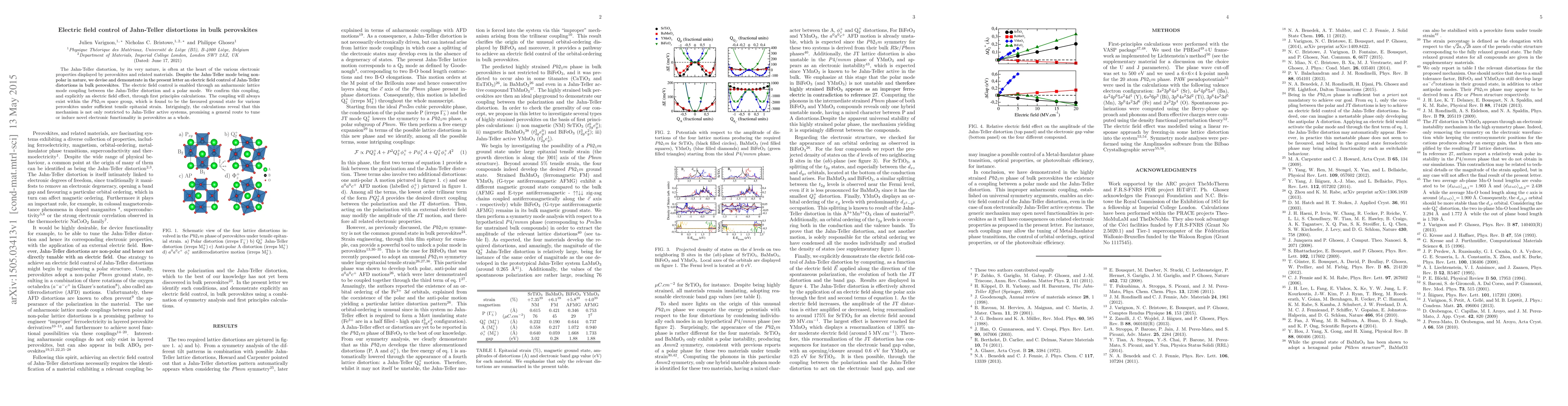 This paper demonstrates electric field control of Jahn-Teller distortions in bulk perovskites via anharmonic lattice mode coupling, confirmed through first principles calculations. This mechanism, applicable to perovskites under tensile epitaxial strain, offers a general route for tuning electronic properties.
