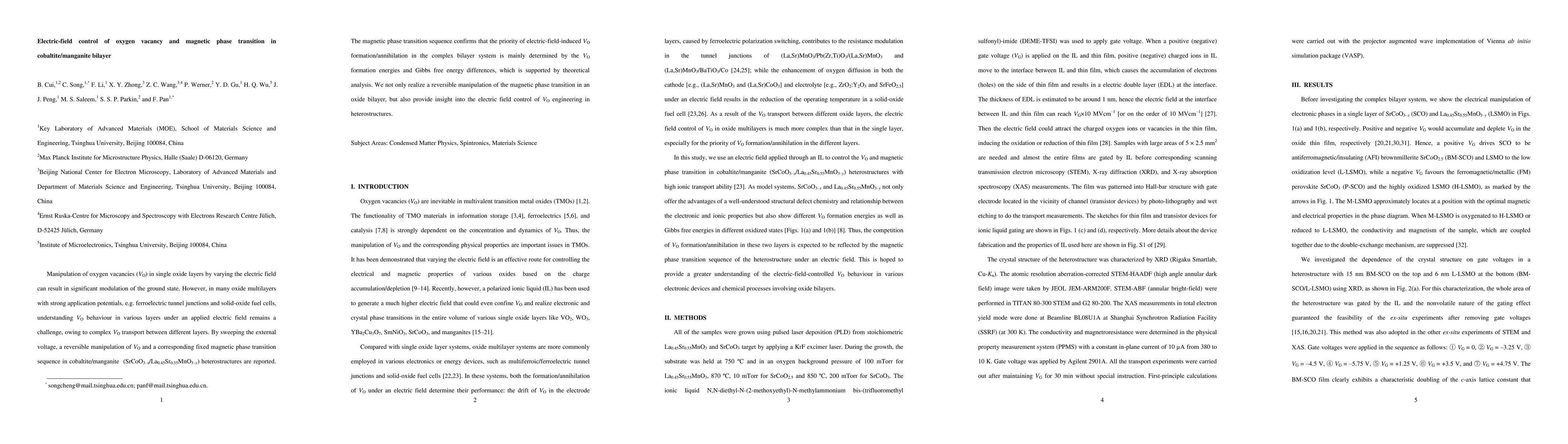 This paper reports reversible manipulation of oxygen vacancies and magnetic phase transitions in cobaltite/manganite bilayers using an electric field, revealing the priority of vacancy formation/annihilation determined by formation energies and Gibbs free energy differences, supported by theoretical analysis. This insight provides a pathway for controlling magnetic properties in complex oxide heterostructures.
