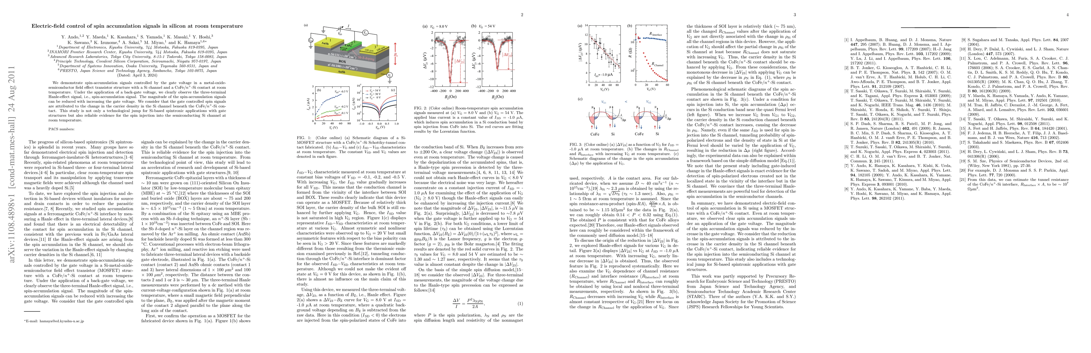 This study demonstrates gate-voltage control of spin-accumulation signals in a Si-based metal-oxide-semiconductor field effect transistor at room temperature, revealing a three-terminal Hanle-effect signal that can be modulated by the gate voltage. The findings suggest a mechanism involving changes in carrier density, offering potential for Si-based spintronic applications.