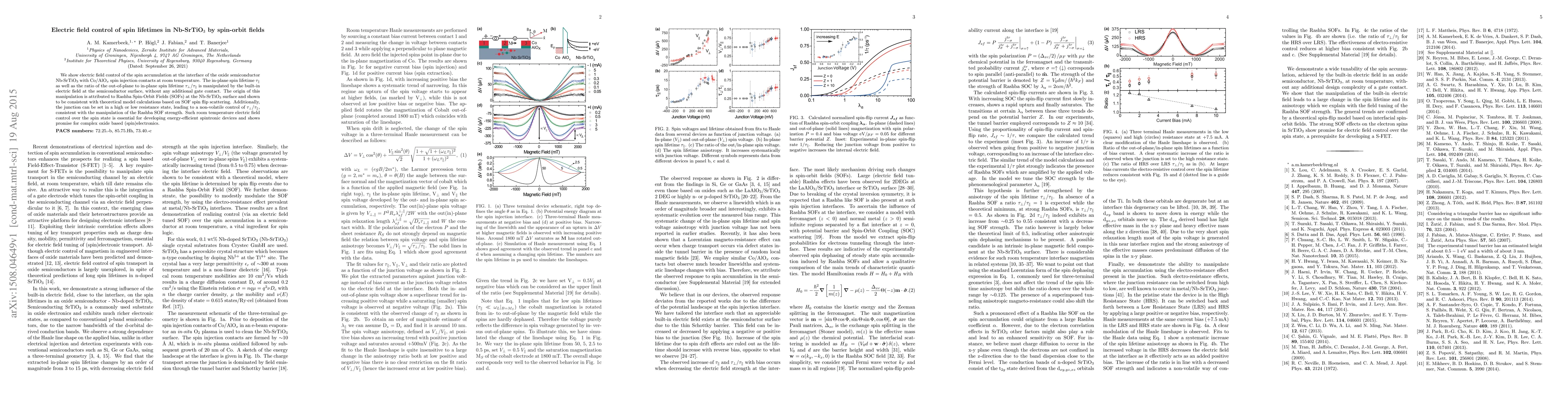 This paper demonstrates the electric field control of spin lifetimes in Nb-SrTiO$_3$ via Rashba Spin-Orbit Fields, achieved without additional gate contacts, which is crucial for developing energy-efficient spintronic devices. The manipulation of spin lifetimes is consistent with theoretical models and can set the junction in high or low resistance states.