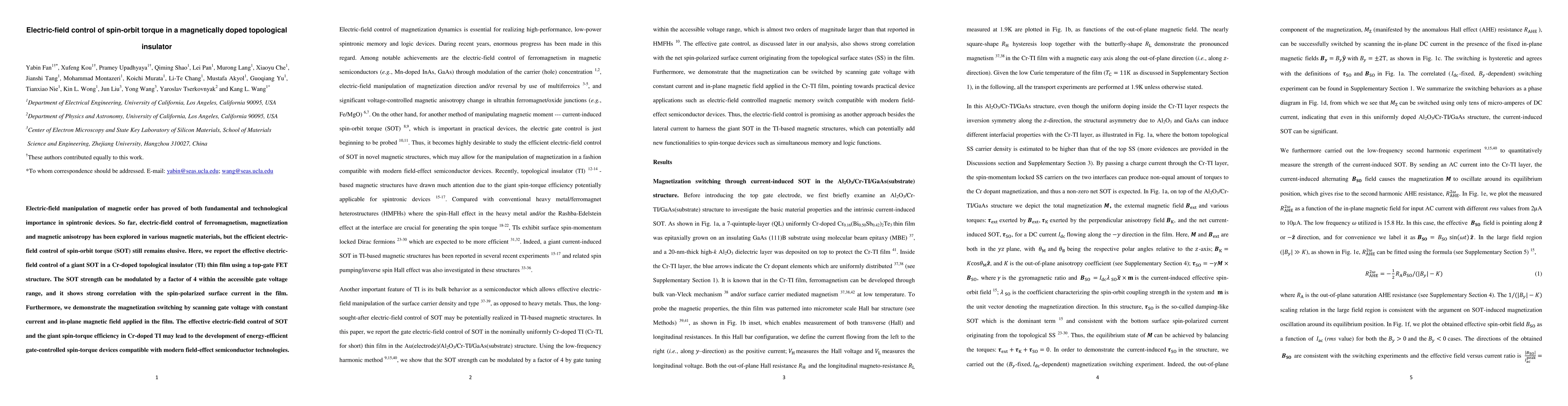 This paper reports the successful electric-field control of a giant spin-orbit torque in a Cr-doped topological insulator using a top-gate FET structure, enabling magnetization switching and demonstrating potential for energy-efficient, gate-controlled spin-torque devices. The SOT strength is modulated by a factor of 4 within the gate voltage range, correlating with spin-polarized surface current.