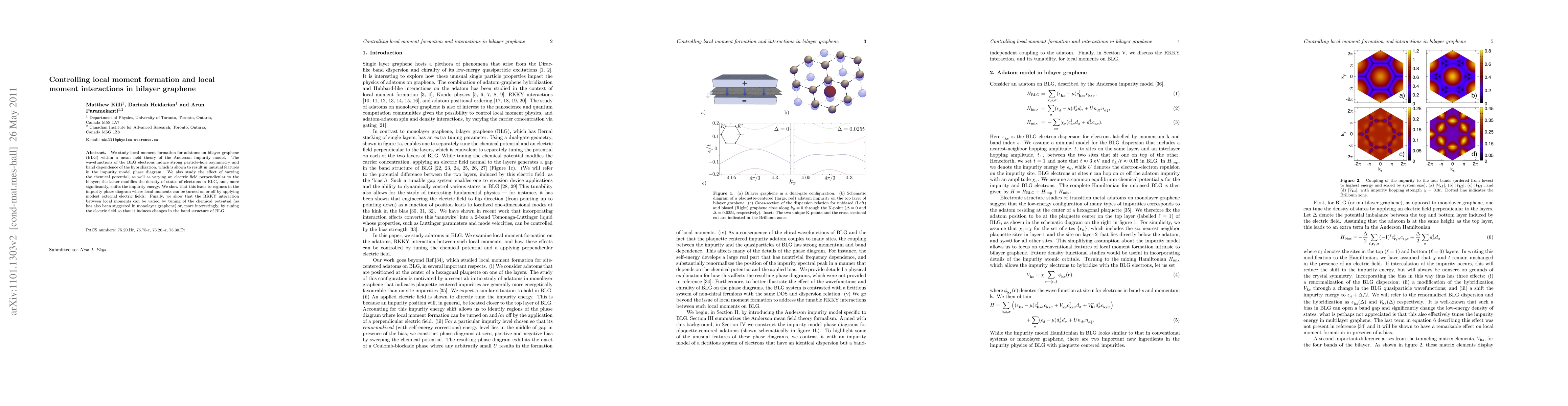 This paper investigates the formation and control of local moments in adatoms on bilayer graphene using the Anderson impurity model and explores how external electric fields can manipulate these local moments and their interactions, demonstrating that spin states can be toggled by modest electric fields.