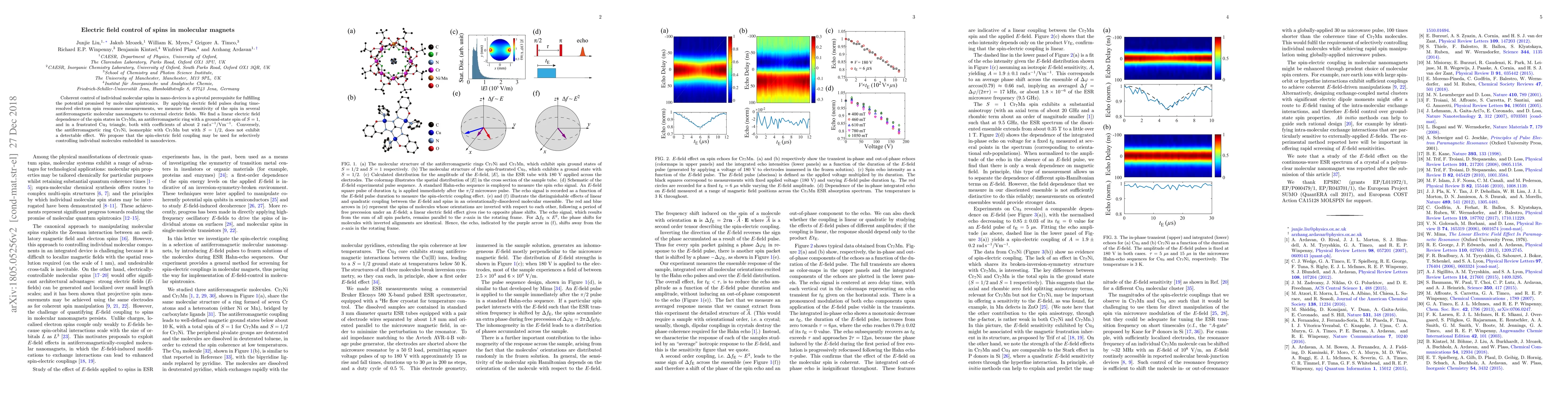 Coherent control of individual molecular spins in nano-devices is a pivotal prerequisite for fulfilling the potential promised by molecular spintronics. By applying electric field pulses during time-resolved electron spin resonance measurements, we measure the sensitivity of the spin in several antiferromagnetic molecular nanomagnets to external electric fields. We find a linear electric field dependence of the spin states in Cr$_7$Mn, an antiferromagnetic ring with a ground-state spin of $S=1$, and in a frustrated Cu$_3$ triangle, both with coefficients of about $2~\mathrm{rad}\, \mathrm{s}^{-1} / \mathrm{V} \mathrm{m}^{-1}$. Conversely, the antiferromagnetic ring Cr$_7$Ni, isomorphic with Cr$_7$Mn but with $S=1/2$, does not exhibit a detectable effect. We propose that the spin-electric field coupling may be used for selectively controlling individual molecules embedded in nanodevices.