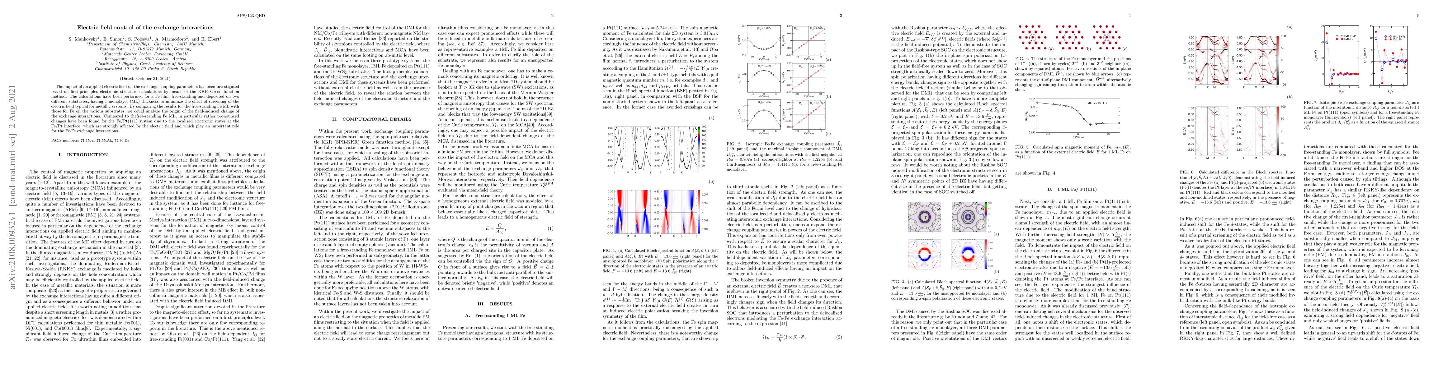 Researchers used first-principles calculations to study how an electric field affects exchange interactions in a thin iron film on different substrates, finding that it can alter the strength of these interactions in certain systems.