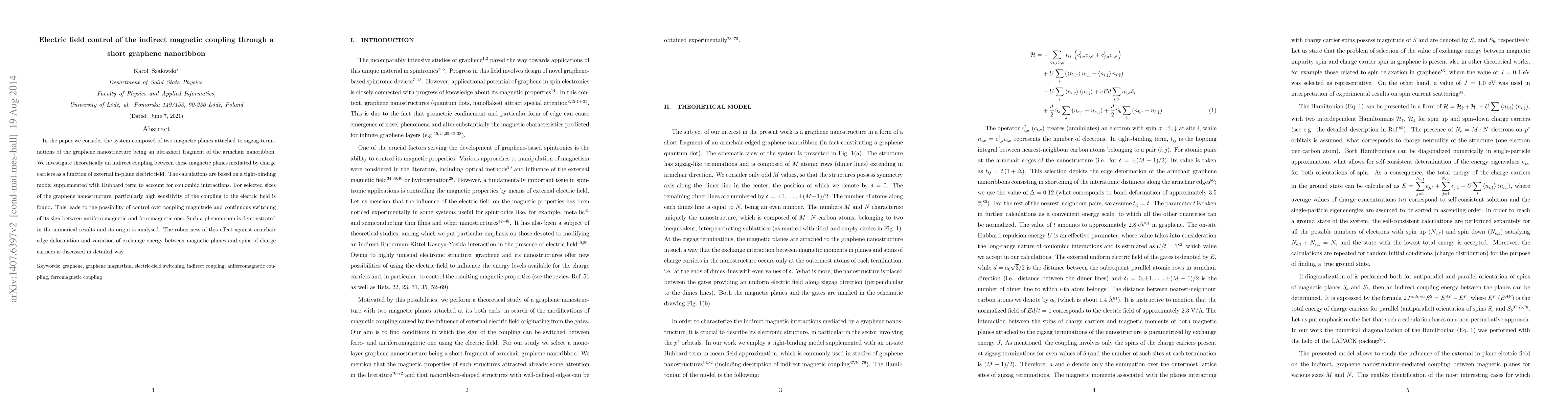 This research investigates the electric field control of indirect magnetic coupling between magnetic planes attached to a zigzag-terminated graphene nanoribbon using a tight-binding model. The study finds high sensitivity of coupling to the electric field, enabling continuous switching between antiferromagnetic and ferromagnetic coupling states.