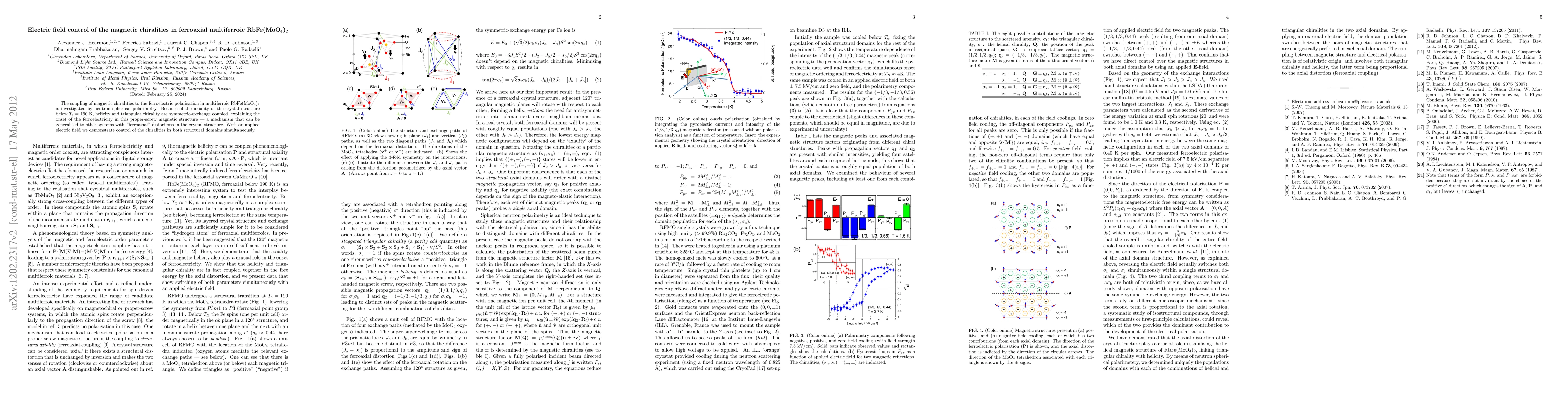 The coupling of magnetic chiralities to the ferroelectric polarisation in multiferroic RbFe(MoO$_4$)$_2$ is investigated by neutron spherical polarimetry. Because of the axiality of the crystal structure below $T_\textrm{c}$ = 190 K, helicity and triangular chirality are symmetric-exchange coupled, explaining the onset of the ferroelectricity in this proper-screw magnetic structure - a mechanism that can be generalised to other systems with "ferroaxial" distortions in the crystal structure. With an applied electric field we demonstrate control of the chiralities in both structural domains simultaneously.