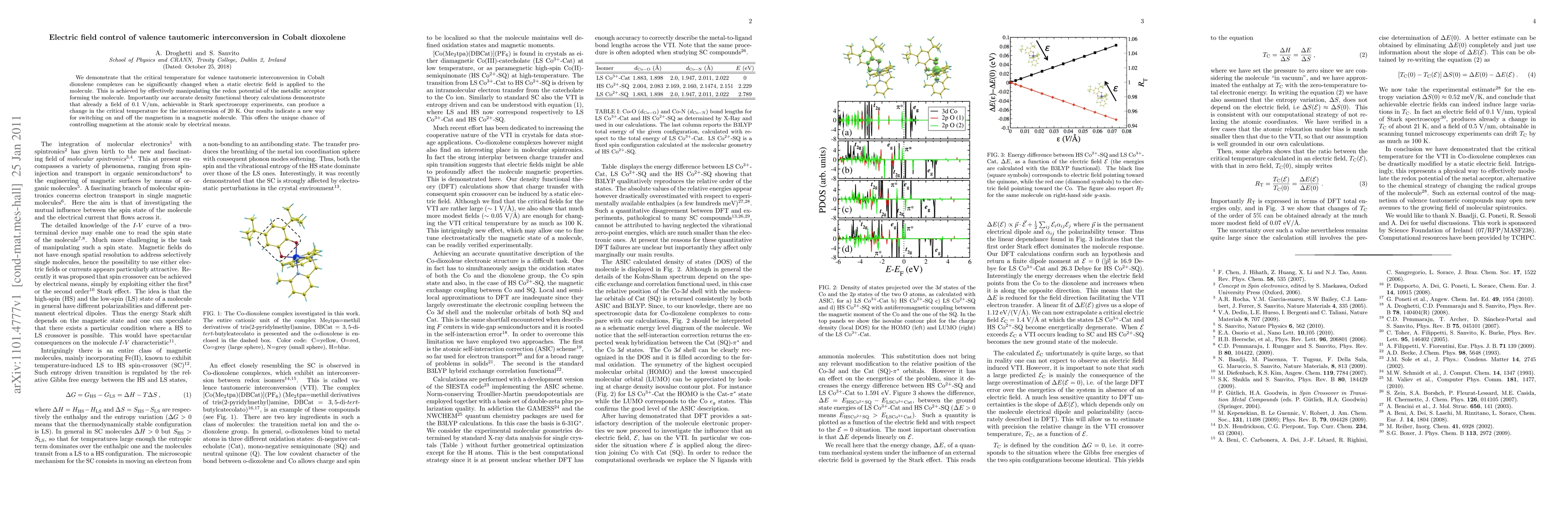 We demonstrate that the critical temperature for valence tautomeric interconversion in Cobalt dioxolene complexes can be significantly changed when a static electric field is applied to the molecule. This is achieved by effectively manipulating the redox potential of the metallic acceptor forming the molecule. Importantly our accurate density functional theory calculations demonstrate that already a field of 0.1 V/nm, achievable in Stark spectroscopy experiments, can produce a change in the critical temperature for the interconversion of 20 K. Our results indicate a new way for switching on and off the magnetism in a magnetic molecule. This offers the unique chance of controlling magnetism at the atomic scale by electrical means.