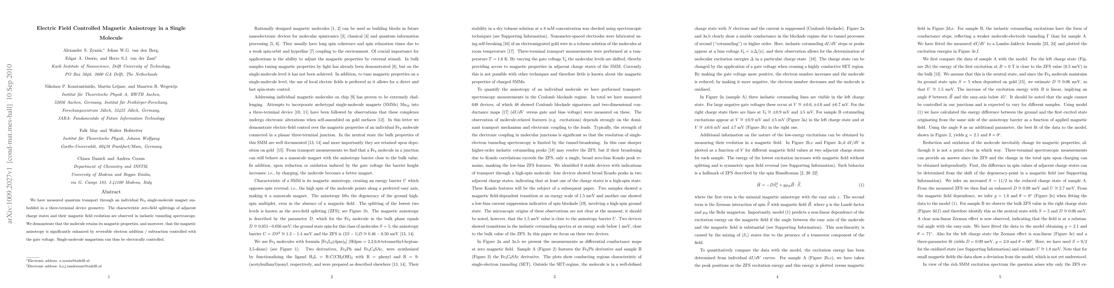 This study investigates quantum transport through a single Fe$_4$ molecule in a three-terminal device, revealing enhanced magnetic anisotropy via electric field control through gate voltage-induced electron addition/subtraction. The findings demonstrate electrically controlled single-molecule magnetism.
