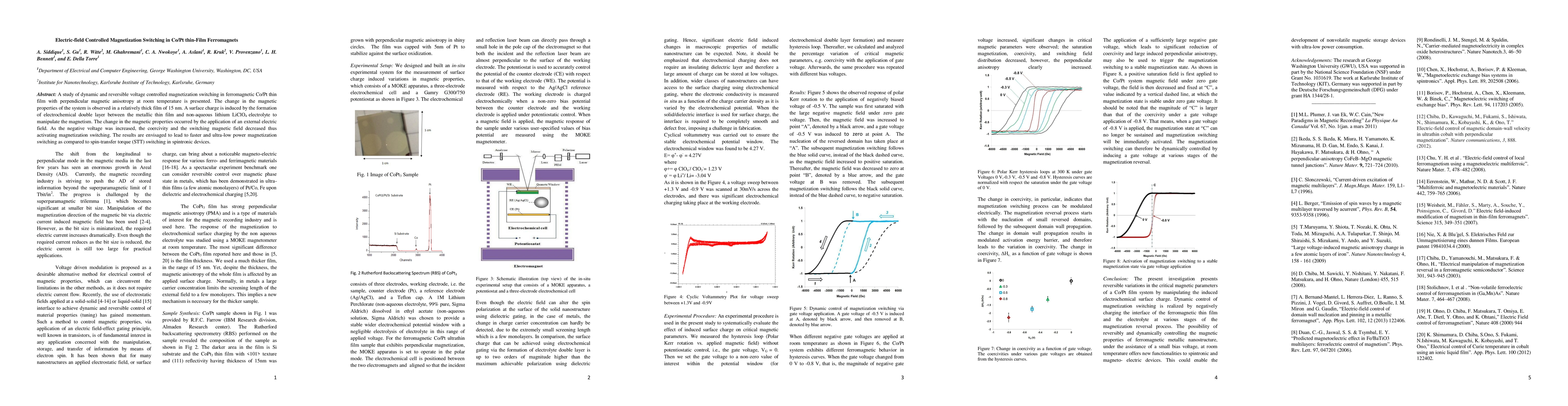 This paper explores electric-field controlled magnetization switching in Co/Pt thin-film ferromagnets via electrochemical double layer formation, demonstrating a reduction in coercivity with increased negative voltage, which may enable faster and lower power switching in spintronic devices compared to traditional methods.