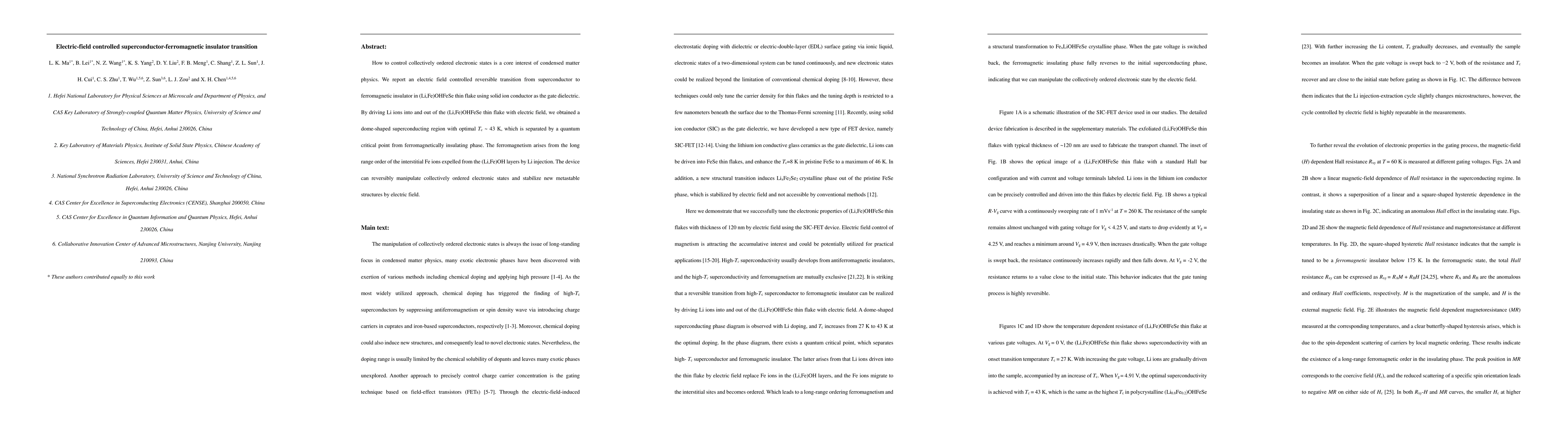 This paper reports an electric field-controlled reversible transition from superconductivity to ferromagnetism in (Li,Fe)OHFeSe thin flakes, facilitated by a solid ion conductor. The transition results from Li ion mobility, enabling a dome-shaped superconducting region and a quantum critical point separating it from a ferromagnetic insulating phase.