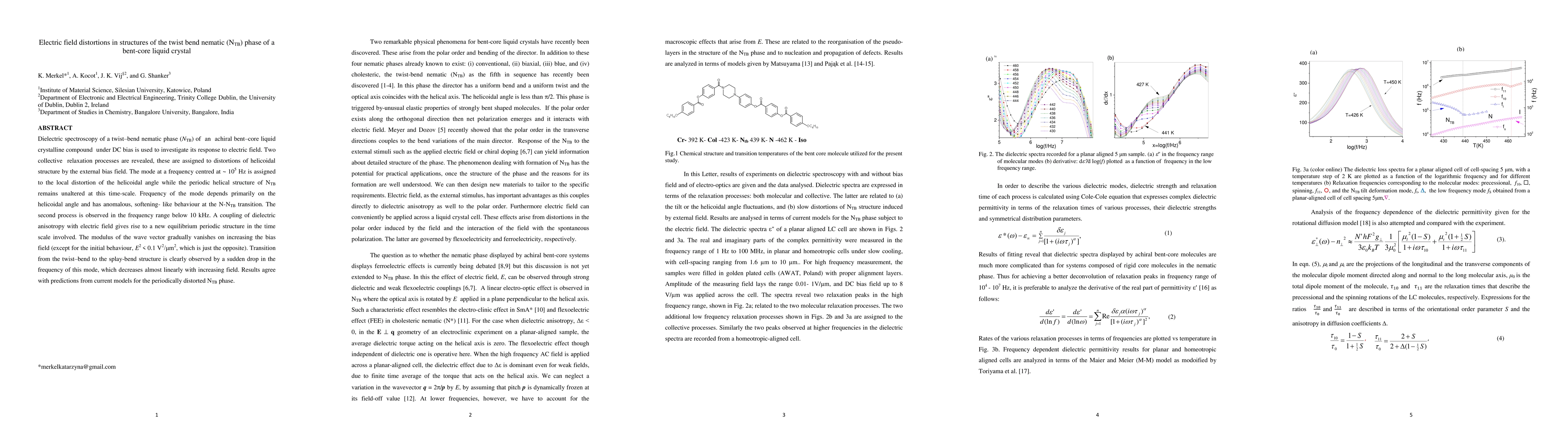 This study investigates the electric field distortions in the twist bend nematic (NTB) phase of a bent-core liquid crystal using dielectric spectroscopy, revealing two relaxation processes linked to structural helicoidal distortions and a transition from twist bend to splay bend structures with increasing electric field. The findings align with current models predicting periodic distortions in the NTB phase.