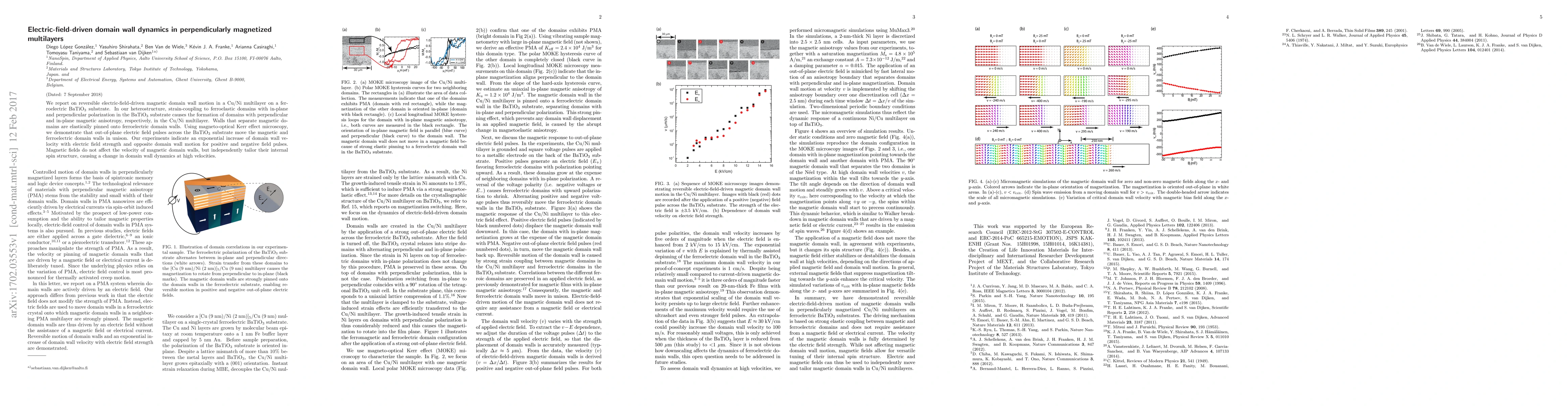 We report on reversible electric-field-driven magnetic domain wall motion in a Cu/Ni multilayer on a ferroelectric BaTiO$_3$ substrate. In our heterostructure, strain-coupling to ferroelastic domains with in-plane and perpendicular polarization in the BaTiO$_3$ substrate causes the formation of domains with perpendicular and in-plane magnetic anisotropy, respectively, in the Cu/Ni multilayer. Walls that separate magnetic domains are elastically pinned onto ferroelectric domain walls. Using magneto-optical Kerr effect microscopy, we demonstrate that out-of-plane electric field pulses across the BaTiO$_3$ substrate move the magnetic and ferroelectric domain walls in unison. Our experiments indicate an exponential increase of domain wall velocity with electric field strength and opposite domain wall motion for positive and negative field pulses. Magnetic fields do not affect the velocity of magnetic domain walls, but independently tailor their internal spin structure, causing a change in domain wall dynamics at high velocities.