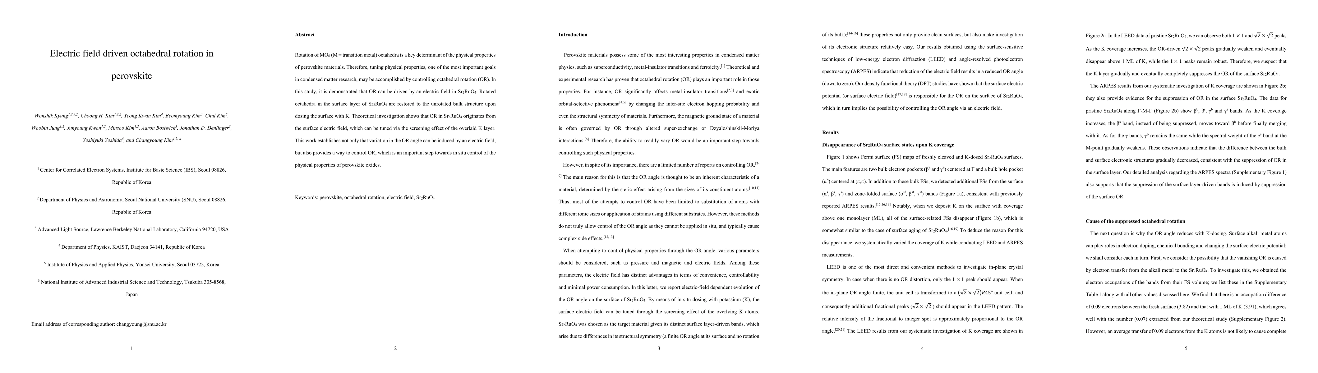 This study demonstrates that electric fields can drive octahedral rotation in perovskite Sr$_2$RuO$_4$, showing that the surface electric field can be tuned by a K layer. This provides a method to control octahedral rotation, which is crucial for manipulating the physical properties of perovskite oxides.