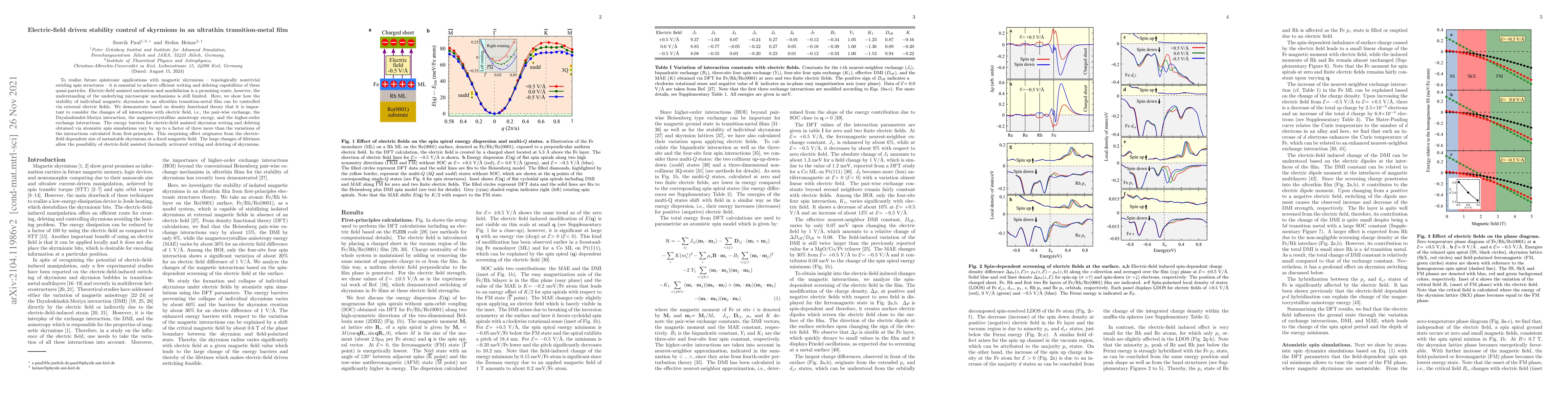 This paper demonstrates that electric fields can control the stability of magnetic skyrmions in ultrathin transition-metal films, crucial for spintronic applications. It reveals that electric fields significantly affect multiple interactions, leading to large variations in energy barriers for skyrmion creation and annihilation, thus enabling thermally activated electric-field driven skyrmion manipulation.