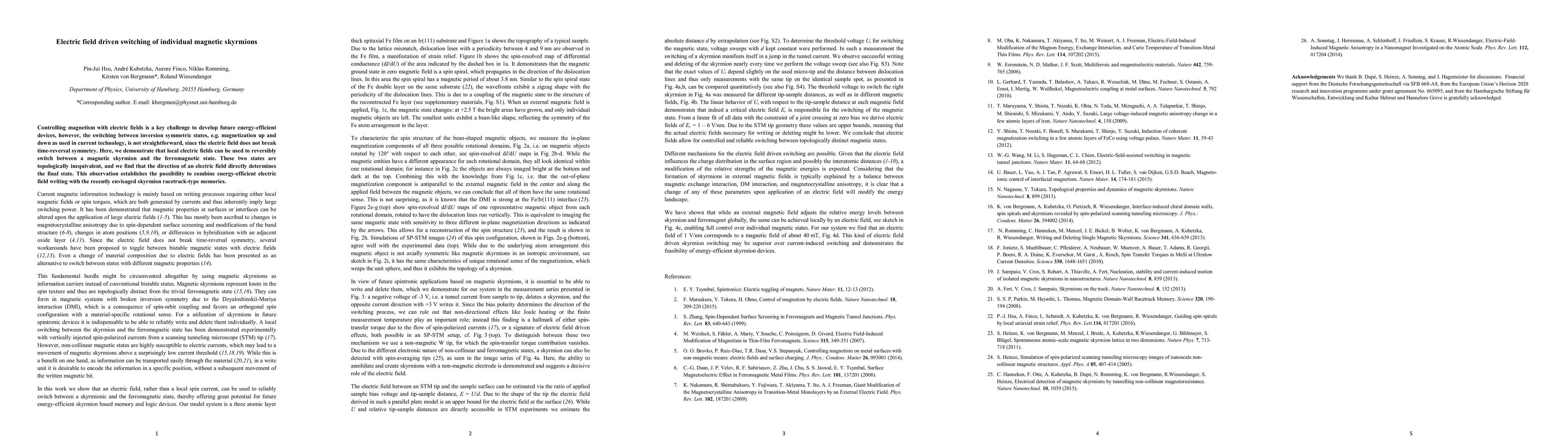 This research demonstrates the use of electric fields to switch between magnetic skyrmions and ferromagnetic states, establishing a potential method for energy-efficient electric field writing in skyrmion-based memory devices.