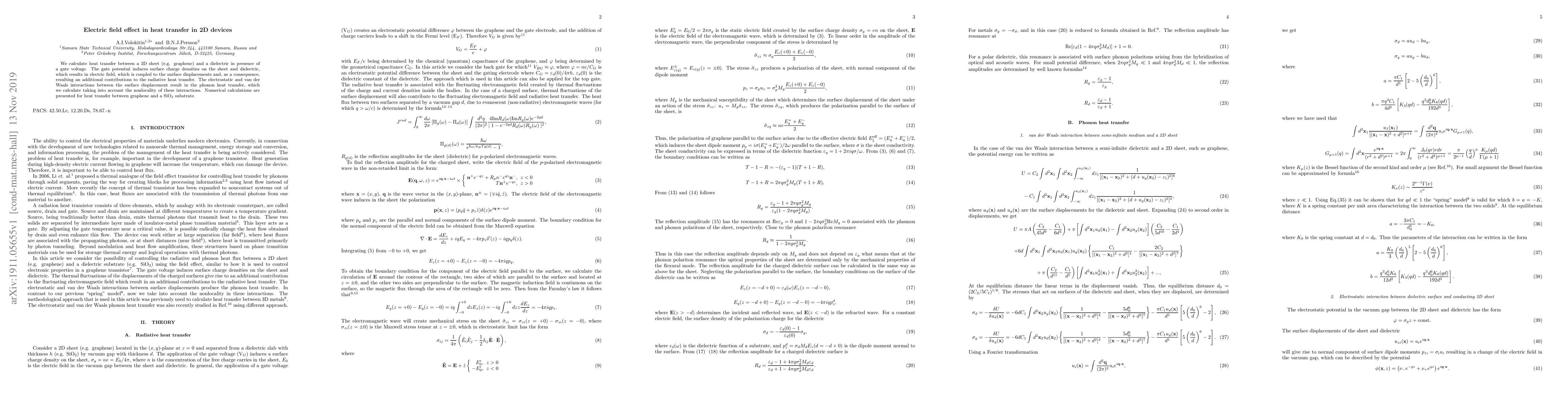 We calculate heat transfer between a 2D sheet (e.g. graphene) and a dielectric in presence of a gate voltage. The gate potential induces surface charge densities on the sheet and dielectric, which results in electric field, which is coupled to the surface displacements and, as a consequence, resulting an additional contributions to the radiative heat transfer. The electrostatic and van der Waals interactions between the surface displacement result in the phonon heat transfer, which we calculate taking into account the nonlocality of these interactions. Numerical calculations are presented for heat transfer between graphene and a SiO$_2$ substrate.