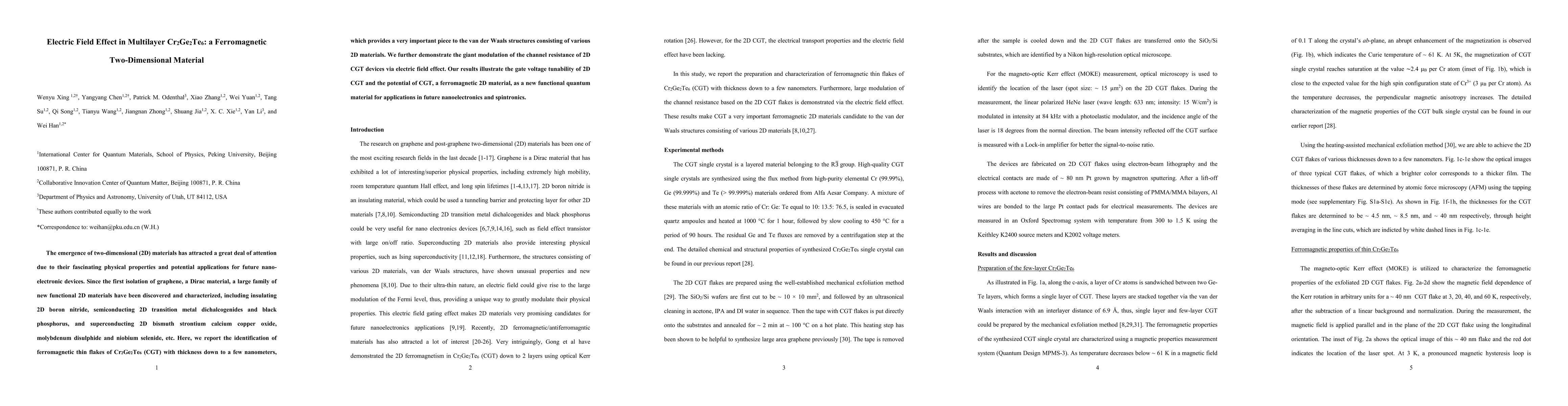 The emergence of two-dimensional (2D) materials has attracted a great deal of attention due to their fascinating physical properties and potential applications for future nanoelectronic devices. Since the first isolation of graphene, a Dirac material, a large family of new functional 2D materials have been discovered and characterized, including insulating 2D boron nitride, semiconducting 2D transition metal dichalcogenides and black phosphorus, and superconducting 2D bismuth strontium calcium copper oxide, molybdenum disulphide and niobium selenide, etc. Here, we report the identification of ferromagnetic thin flakes of Cr2Ge2Te6 (CGT) with thickness down to a few nanometers, which provides a very important piece to the van der Waals structures consisting of various 2D materials. We further demonstrate the giant modulation of the channel resistance of 2D CGT devices via electric field effect. Our results illustrate the gate voltage tunability of 2D CGT and the potential of CGT, a ferromagnetic 2D material, as a new functional quantum material for applications in future nanoelectronics and spintronics.