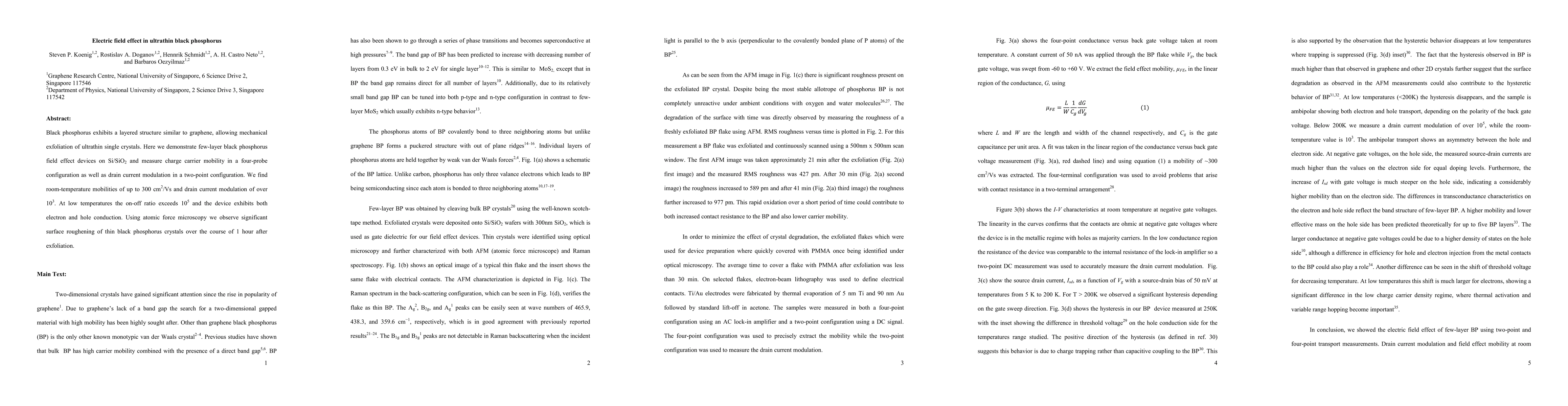 This paper investigates few-layer black phosphorus field effect devices on Si/SiO$_2$, reporting high room-temperature charge carrier mobility up to 300 cm$^2$/Vs and significant drain current modulation of over 10$^3$. Atomic force microscopy reveals notable surface roughening in thin crystals post exfoliation.