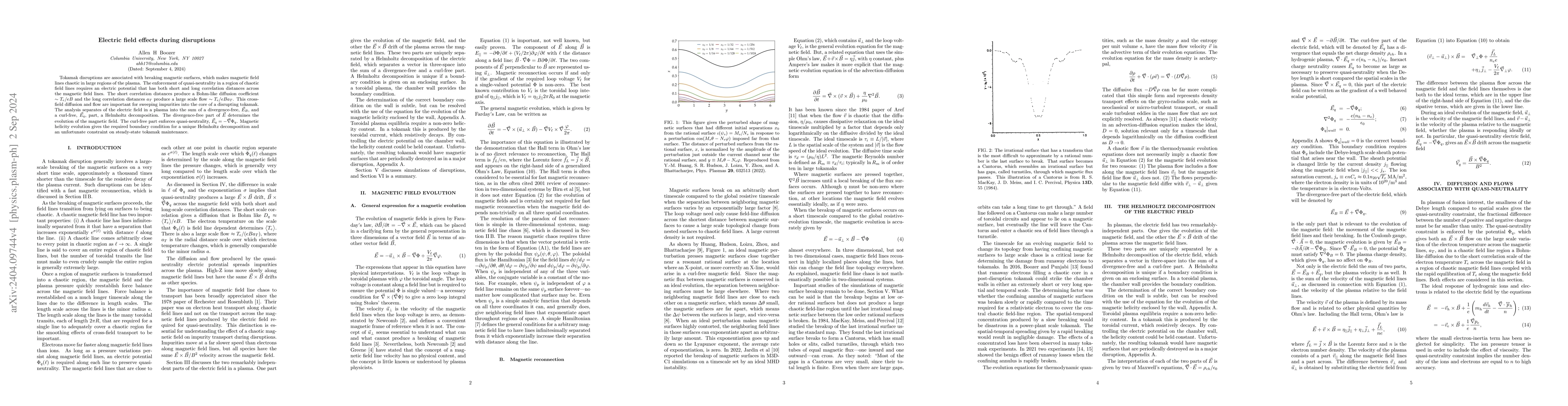 This paper explores the electric field decomposition in tokamak disruptions, identifying two components: $\vec{E}_B$ influencing magnetic field evolution and $\vec{E}_q$ enforcing quasi-neutrality. During disruptions, $\vec{E}_q$ drives Bohm-like diffusion and large-scale flows that help sweep impurities into the plasma core.