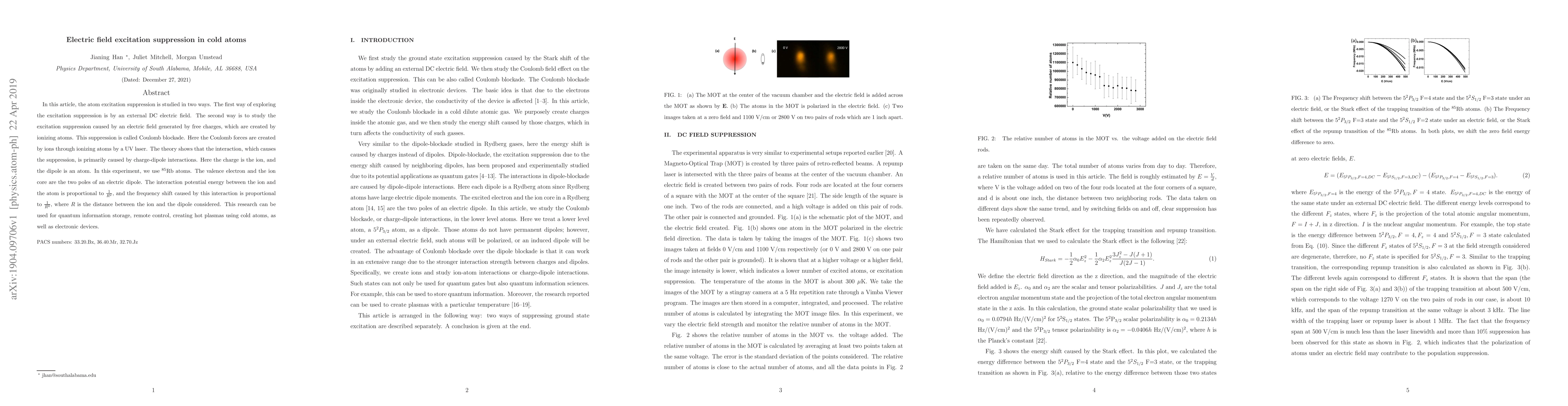 In this article, the atom excitation suppression is studied in two ways. The first way of exploring the excitation suppression is by an external DC electric field. The second way is to study the excitation suppression caused by electric field generated by free charges, which are created by ionizing atoms. This suppression is called Coulomb blockade. Here the Coulomb forces are created by ions through ionizing atoms by a UV laser. The theory shows that the interaction, which causes the suppression, is primarily caused by charge-dipole interactions. Here the charge is the ion, and the dipole is an atom. In this experiment, we use $^{85}$Rb atoms. The valence electron and the ion core are the two poles of an electric dipole. The interaction potential energy between the ion and the atom is proportional to $\frac{1}{R^2}$, and the frequency shift caused by this interaction is proportional to $\frac{1}{R^4}$, where $R$ is the distance between the ion and the dipole considered. This research can be used for quantum information storage, remote control, creating hot plasmas using cold atoms, as well as electronic devices.