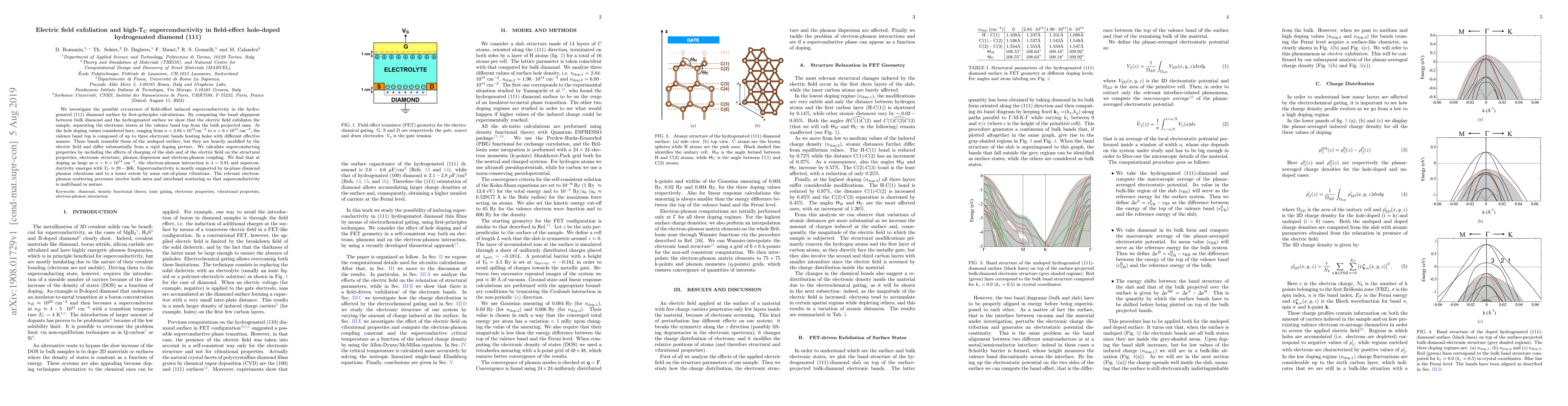This paper explores the potential for field-effect induced superconductivity in hydrogenated diamond (111) surfaces using first-principles calculations. It finds that electric field exfoliation modifies electronic bands and leads to high-temperature superconductivity ($T_{\text{C}}\approx 29-36$K) at high hole doping, primarily driven by in-plane phonon vibrations.