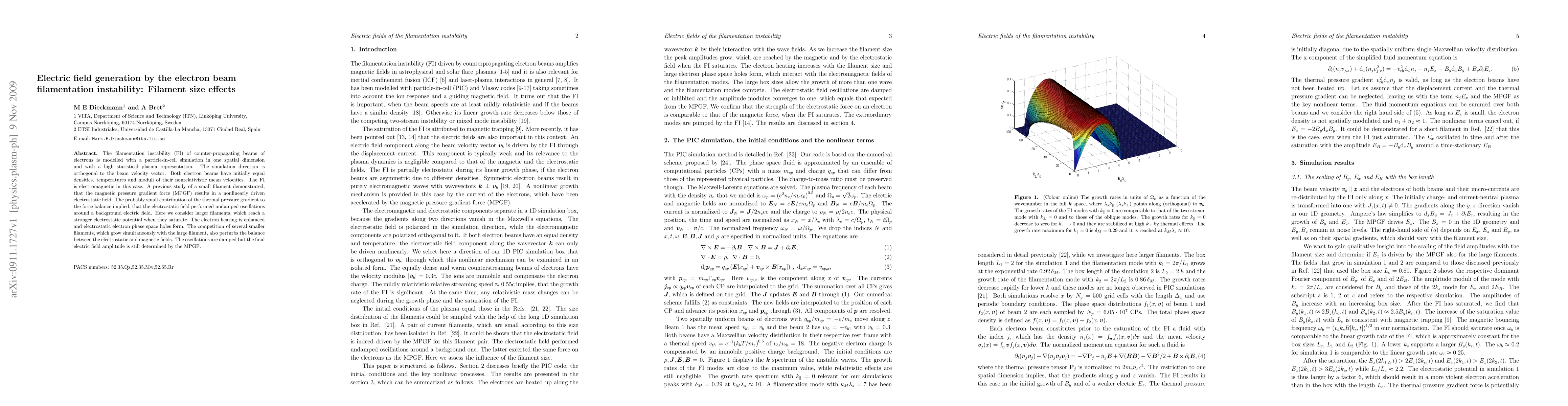 The filamentation instability (FI) of counter-propagating beams of electrons is modelled with a particle-in-cell simulation in one spatial dimension and with a high statistical plasma representation. The simulation direction is orthogonal to the beam velocity vector. Both electron beams have initially equal densities, temperatures and moduli of their nonrelativistic mean velocities. The FI is electromagnetic in this case. A previous study of a small filament demonstrated, that the magnetic pressure gradient force (MPGF) results in a nonlinearly driven electrostatic field. The probably small contribution of the thermal pressure gradient to the force balance implied, that the electrostatic field performed undamped oscillations around a background electric field. Here we consider larger filaments, which reach a stronger electrostatic potential when they saturate. The electron heating is enhanced and electrostatic electron phase space holes form. The competition of several smaller filaments, which grow simultaneously with the large filament, also perturbs the balance between the electrostatic and magnetic fields. The oscillations are damped but the final electric field amplitude is still determined by the MPGF.