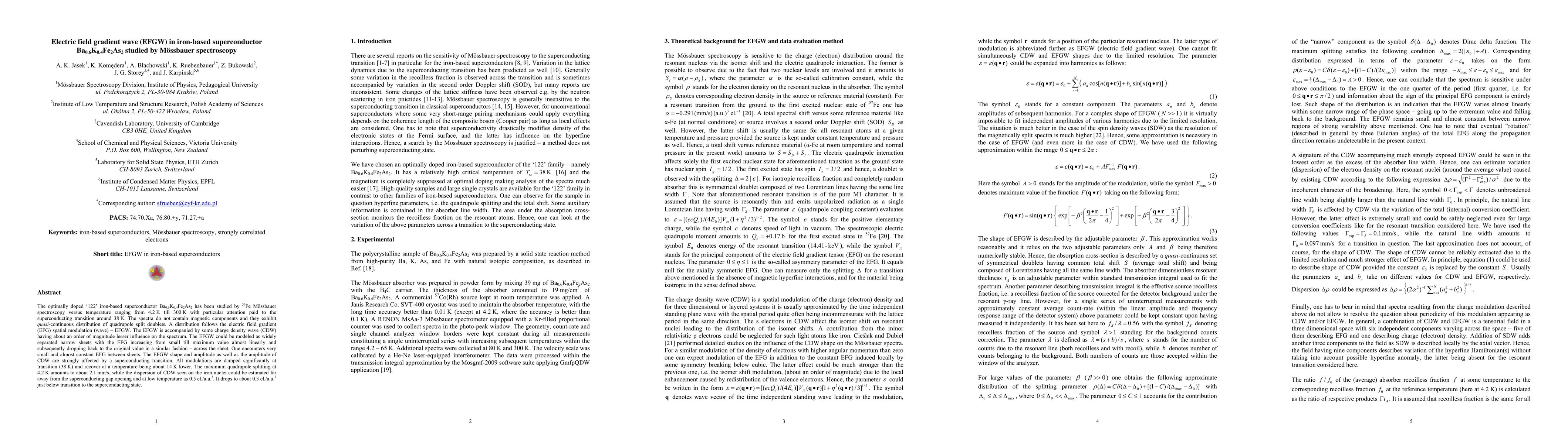 The optimally doped iron-based superconductor Ba(0.6)K(0.4)Fe2As2 exhibits an electric field gradient wave (EFGW) observed via 57Fe Mössbauer spectroscopy, which is dampened at the superconducting transition around 38 K. The EFGW and accompanying charge density wave (CDW) influence the quadrupole splitting, which decreases significantly below the transition temperature.