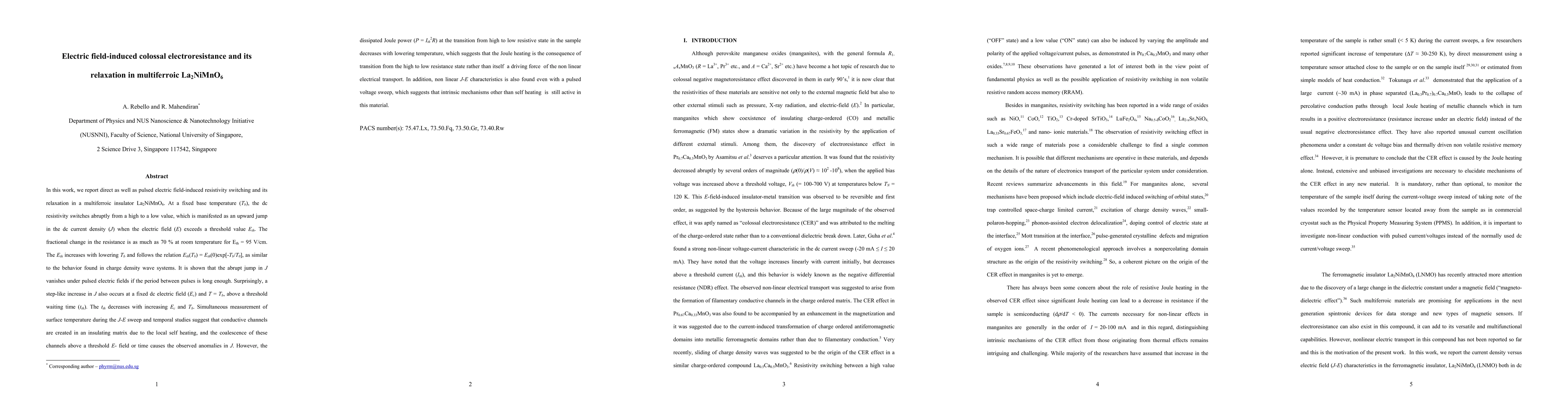 This study investigates electric field-induced colossal electroresistance and its relaxation in the multiferroic insulator La2NiMnO6, revealing abrupt resistivity switching and relaxation phenomena. The material exhibits a 70% resistance change at room temperature when an electric field exceeds a threshold, with the threshold increasing with lower temperatures. Conductive channels form due to local self-heating, causing anomalies in current density, though Joule heating is not the primary driver of the observed effects.