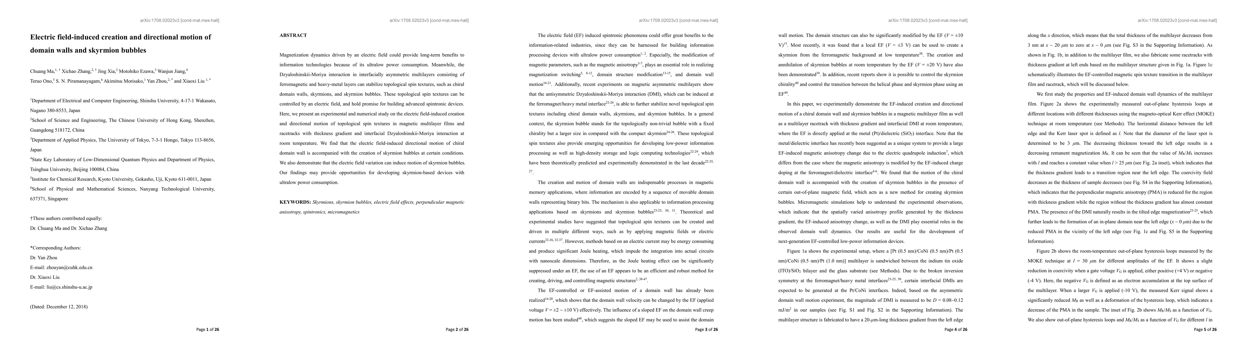 This research explores electric field-induced creation and directional motion of topological spin textures, specifically chiral domain walls and skyrmion bubbles, in magnetic multilayers. The findings demonstrate potential for ultralow power consumption in advanced spintronic devices.