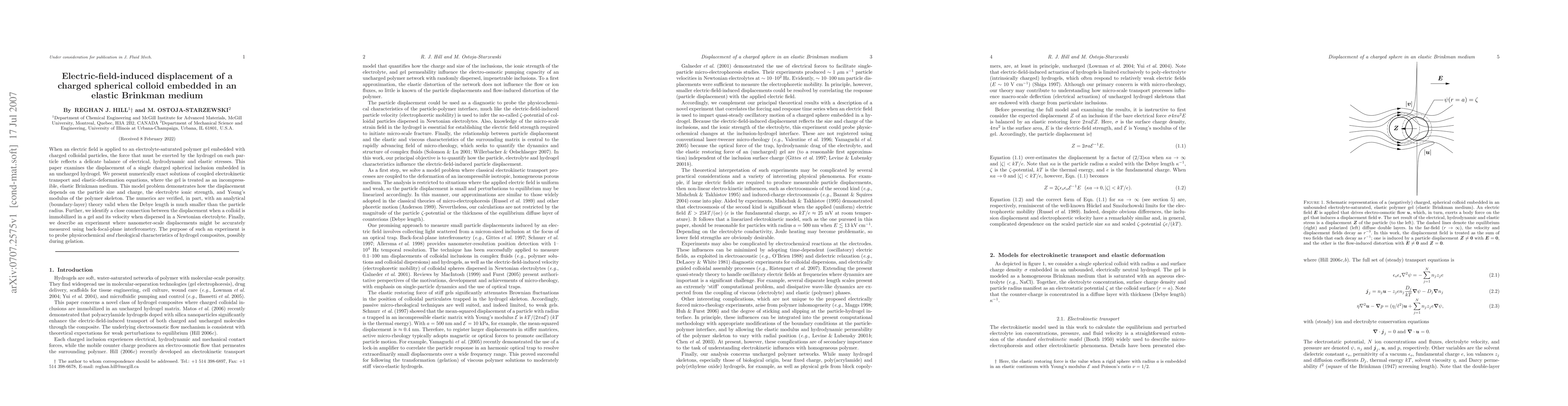 This paper investigates the electric-field-induced displacement of a charged spherical colloid in an elastic Brinkman medium, revealing dependencies on particle size, charge, electrolyte ionic strength, and polymer modulus. Numerical solutions and analytical theory validate the model, highlighting a link between colloidal displacement and dispersion in electrolytes.