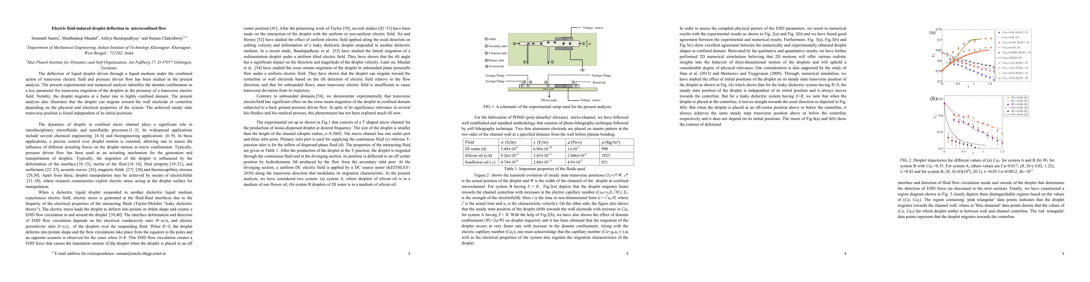 This paper investigates the deflection of liquid droplets under both transverse electric fields and pressure-driven flow, finding that domain confinement significantly influences droplet migration. Droplets migrate faster in highly confined spaces and can move toward either the wall electrode or the centerline based on system properties, with their steady-state position independent of initial positions.