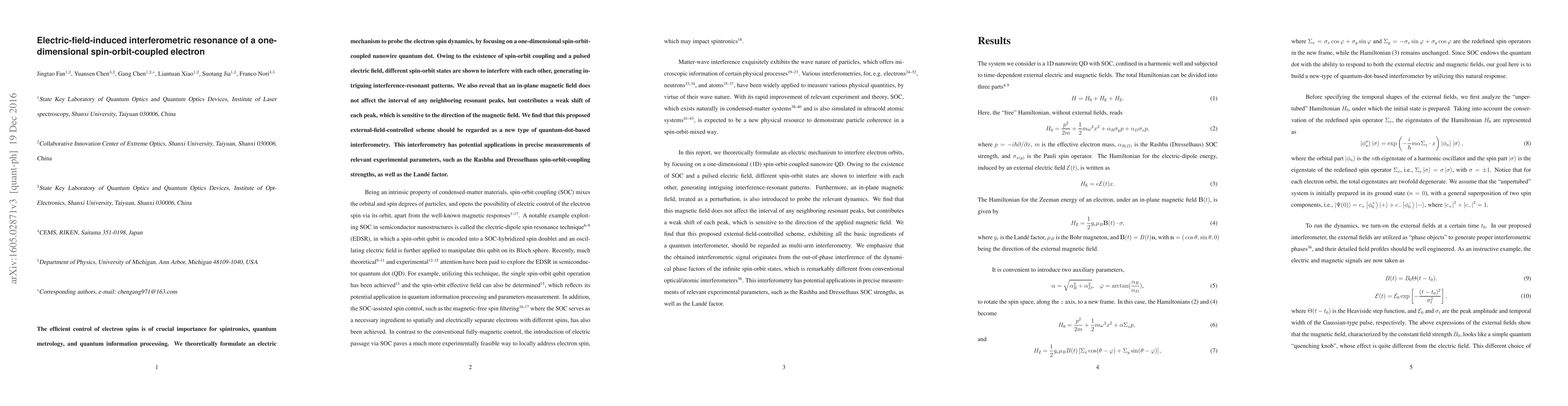 This paper proposes an electric-field-induced interferometric resonance in a one-dimensional spin-orbit-coupled nanowire quantum dot, revealing interference patterns due to spin-orbit coupling and pulsed electric fields. The study also finds that in-plane magnetic fields cause a directional shift in resonant peaks without affecting their strength intervals.