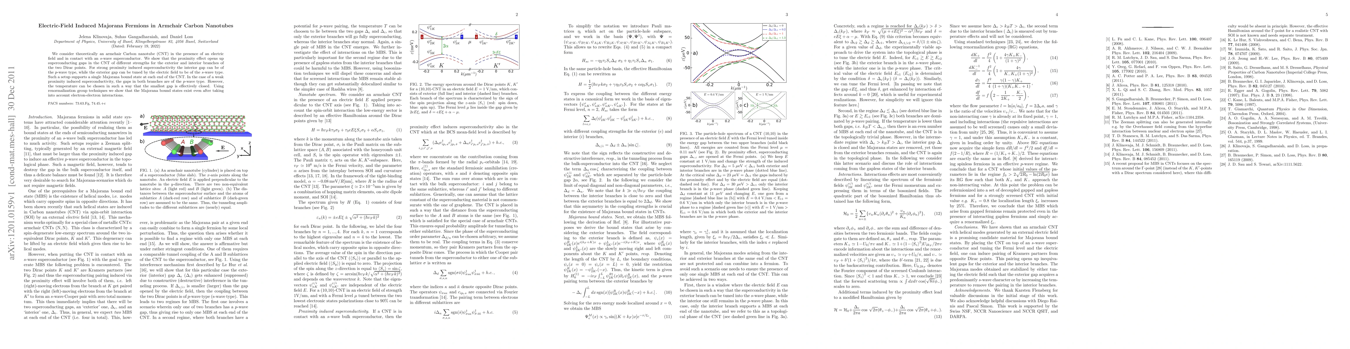 This paper theoretically investigates an armchair carbon nanotube under an electric field and in contact with an s-wave superconductor, demonstrating that it can support Majorana fermions. The study shows that varying the electric field and proximity-induced superconductivity can lead to different types of superconducting gaps, resulting in a single Majorana bound state at each end of the nanotube.