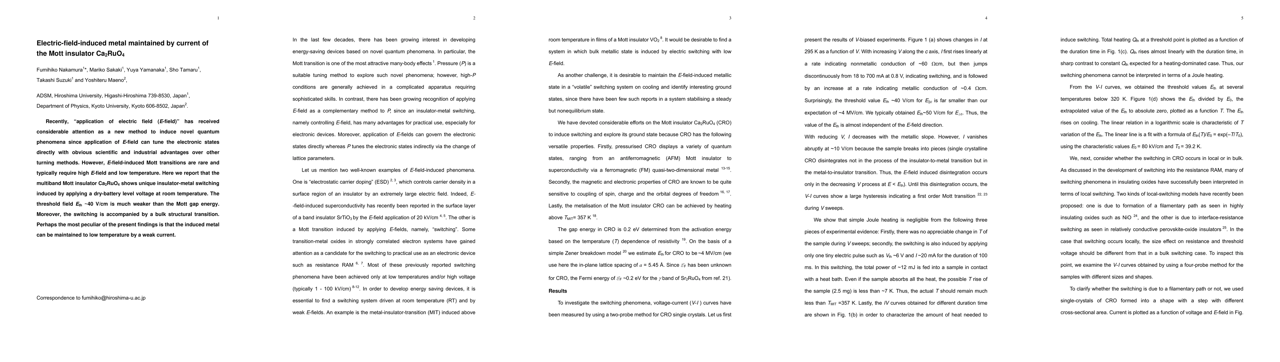 Recently, application of electric field (E-field) has received considerable attention as a new method to induce novel quantum phenomena since application of E-field can tune the electronic states directly with obvious scientific and industrial advantages over other turning methods. However, E-field-induced Mott transitions are rare and typically require high E-field and low temperature. Here we report that the multiband Mott insulator Ca2RuO4 shows unique insulator-metal switching induced by applying a dry-battery level voltage at room temperature. The threshold field Eth ~40 V/cm is much weaker than the Mott gap energy. Moreover, the switching is accompanied by a bulk structural transition. Perhaps the most peculiar of the present findings is that the induced metal can be maintained to low temperature by a weak current.