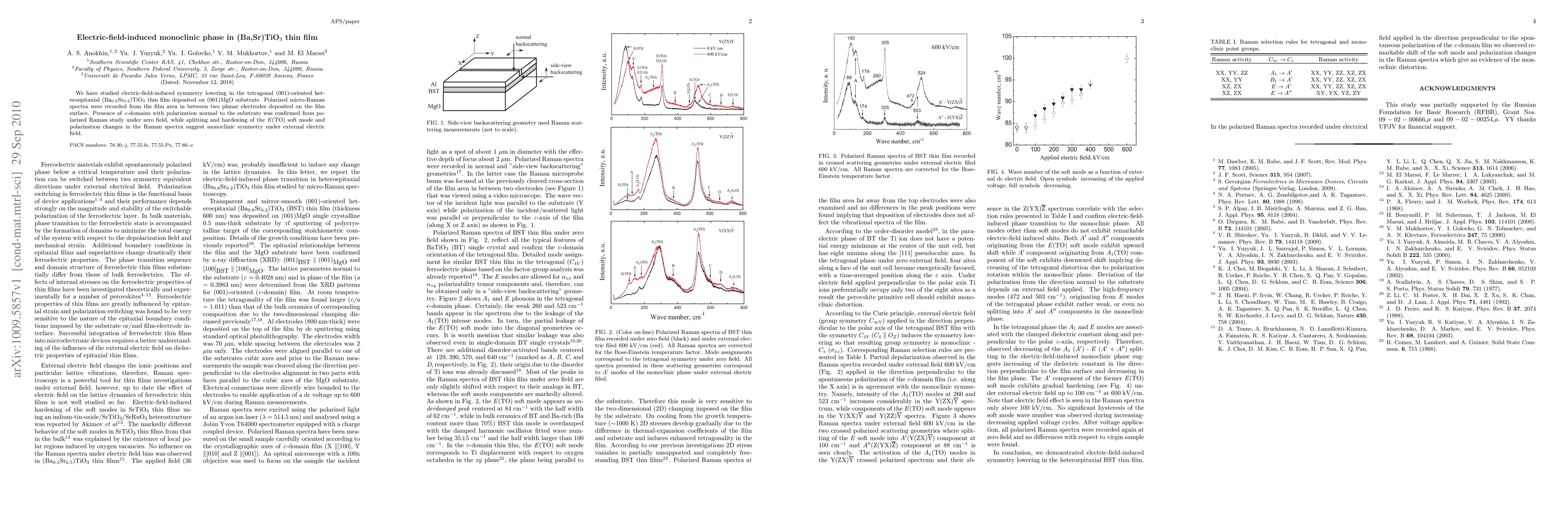 This study investigates the electric-field-induced phase transition in (Ba$_{0.8}$Sr$_{0.2}$)TiO$_3$ thin films, showing symmetry lowering from tetragonal to monoclinic through polarized micro-Raman spectroscopy, revealing \textit{c}-domains and changes in Raman spectra under external electric fields.