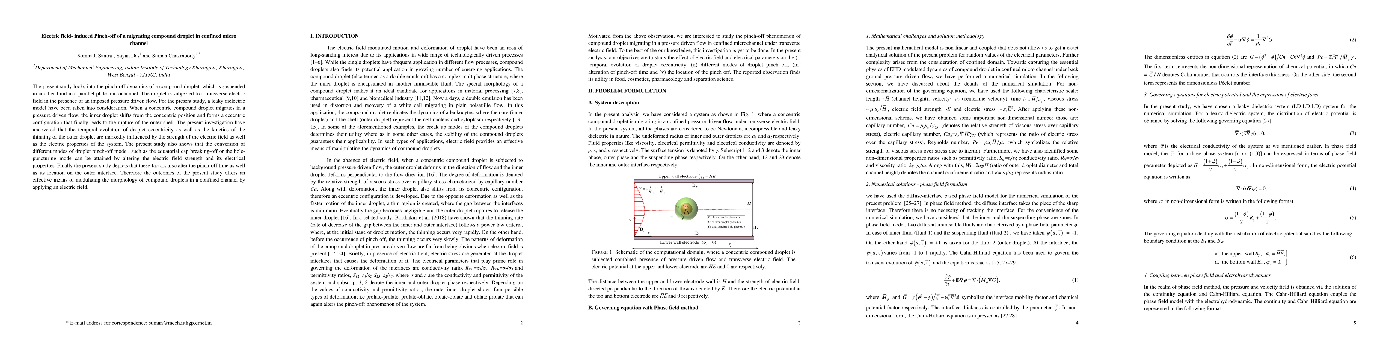 This study investigates the pinch-off dynamics of a compound droplet in a microchannel under a transverse electric field and pressure-driven flow. The electric field significantly influences the droplet's eccentricity and the thinning kinetics, enabling the modulation of pinch-off modes and altering pinch-off time and location.