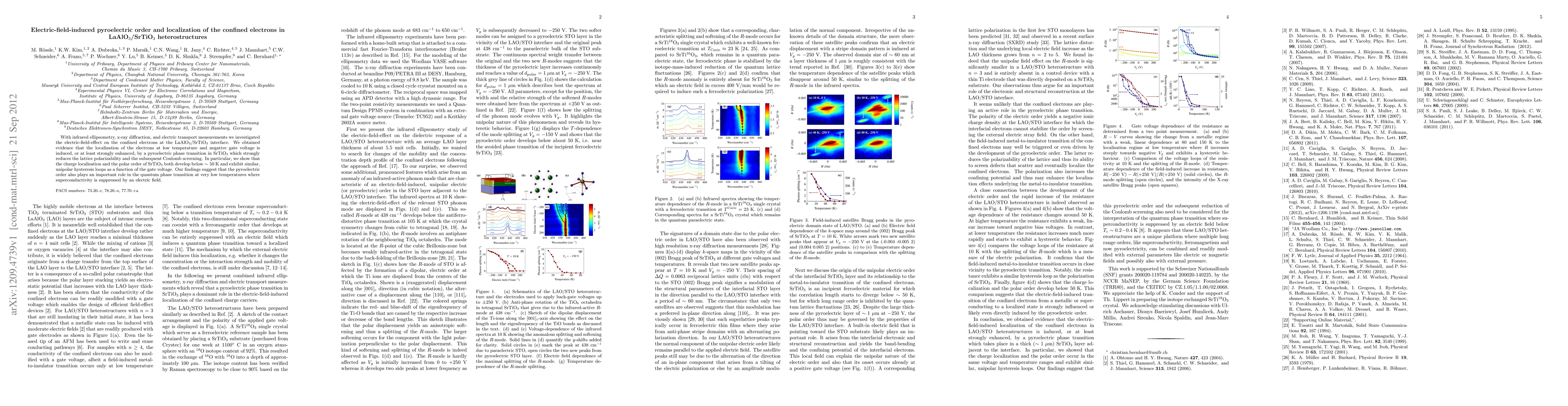 With infrared ellipsometry, x-ray diffraction, and electric transport measurements we investigated the electric-field-effect on the confined electrons at the LaAlO3/SrTiO3 interface. We obtained evidence that the localization of the electrons at low temperature and negative gate voltage is induced, or at least strongly enhanced, by a pyroelectric phase transition in SrTiO3 which strongly reduces the lattice polarizability and the subsequent Coulomb screening. In particular, we show that the charge localisation and the polar order of SrTiO3 both develop below about 50 K and exhibit similar, unipolar hysteresis loops as a function of the gate voltage. Our findings suggest that the pyroelectric order also plays an important role in the quantum phase transition at very low temperatures where superconductivity is suppressed by an electric field.