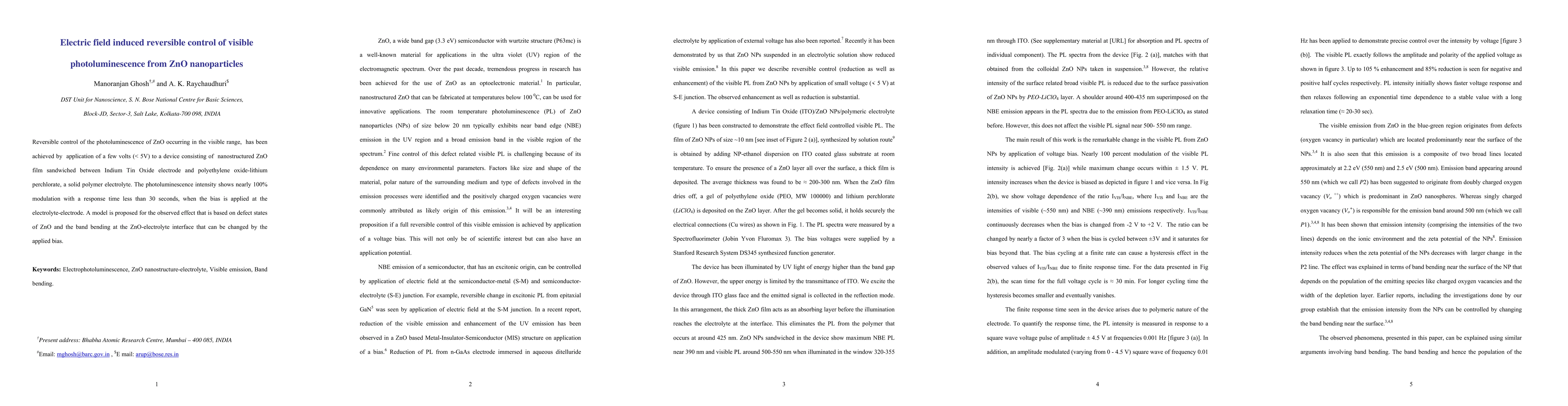 This paper demonstrates reversible modulation of visible photoluminescence in ZnO nanoparticles via electric field control using a few volts, achieving nearly 100% intensity modulation in under 30 seconds. The proposed model attributes the effect to defect states and band bending at the ZnO-electrolyte interface.