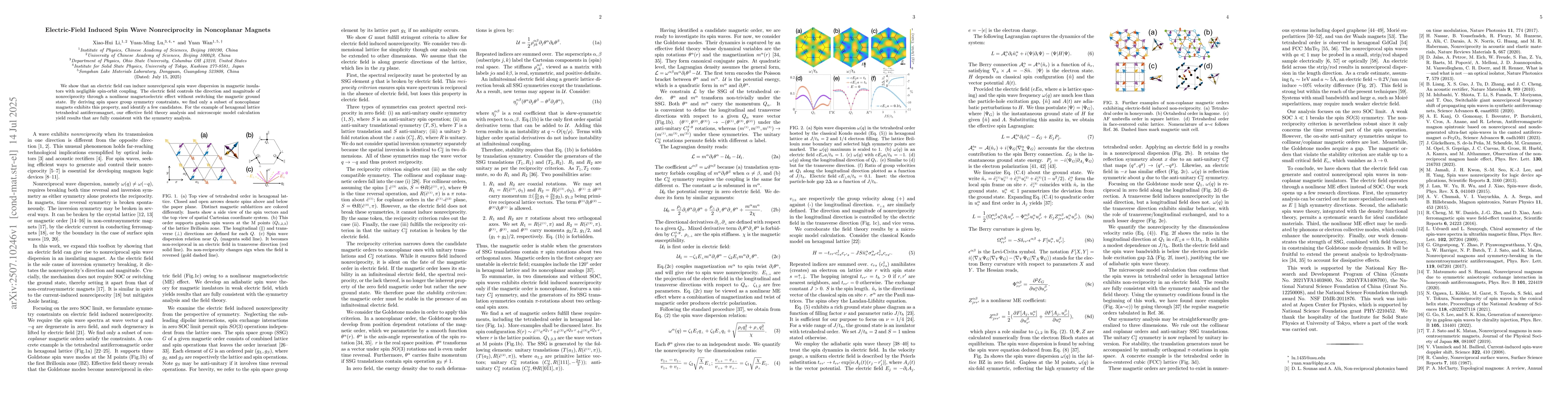 We show that an electric field can induce nonreciprocal spin wave dispersion in magnetic insulators with negligible spin-orbit coupling. The electric field controls the direction and magnitude of nonreciprocity through a nonlinear magnetoelectric effect without switching the magnetic ground state. By deriving spin space group symmetry constraints, we find only a subset of noncoplanar magnets exhibits this property, and identify a few candidates. For the example of hexagonal lattice tetrahedral antiferromagnet, our effective field theory analysis and microscopic model calculation yield results that are fully consistent with the symmetry analysis.