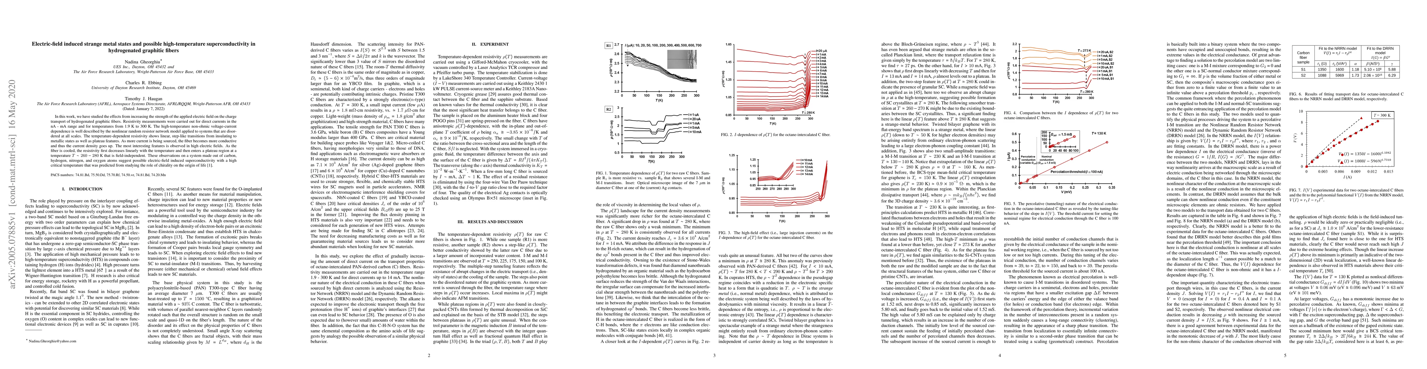 Researchers studied how high electric fields affect conductivity in hydrogenated graphitic fibers, finding linear, step-like transitions to metallic states and potential for electric-field induced superconductivity at high temperatures.