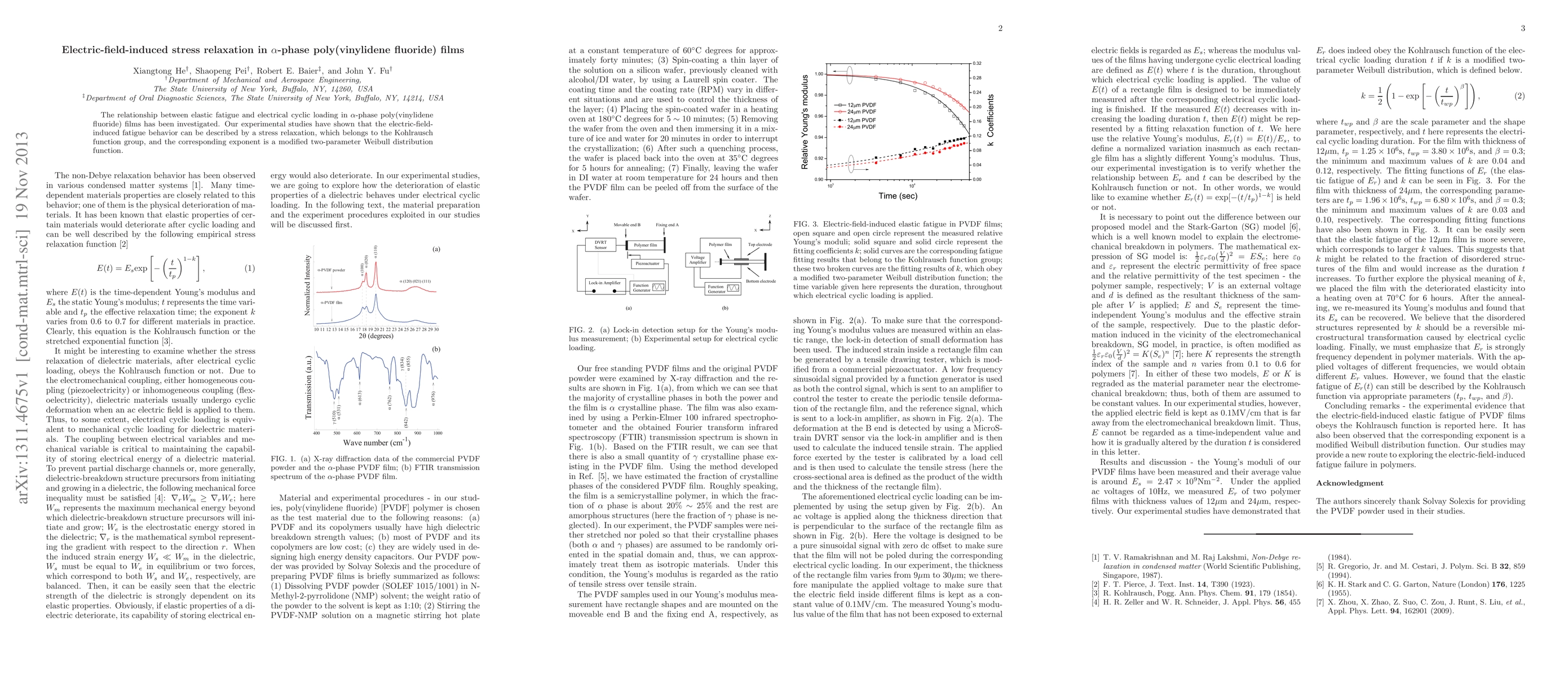 The relationship between elastic fatigue and electrical cyclic loading in alpha-phase poly(vinylidene fluoride) films has been investigated. Our experimental studies have shown that the electric-field-induced fatigue behavior can be described by a stress relaxation, which belongs to the Kohlrausch function group, and the corresponding exponent is a modified two-parameter Weibull distribution function.