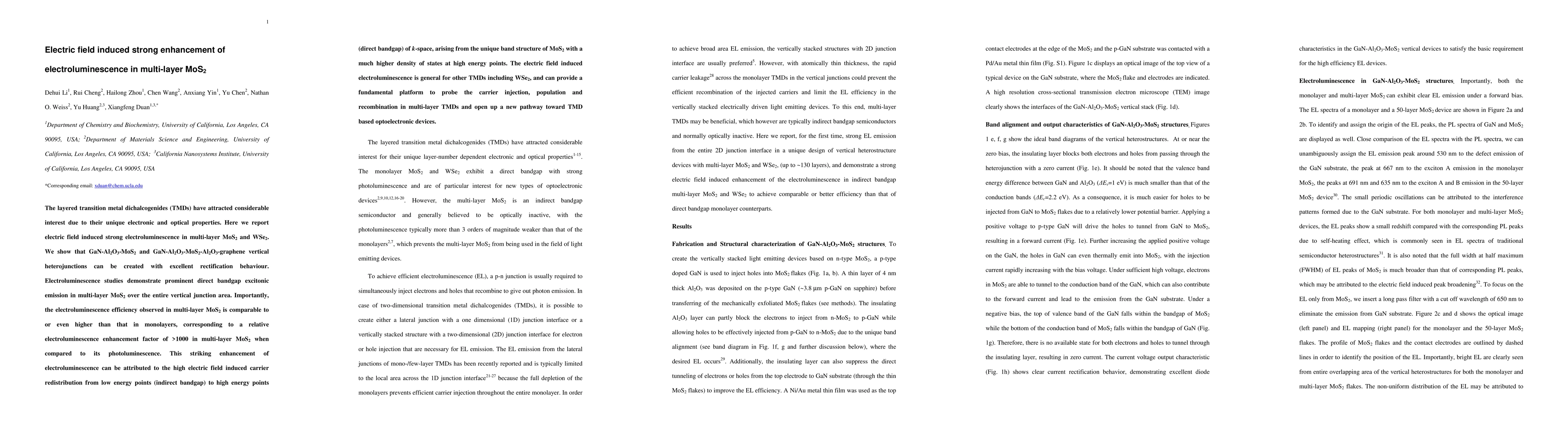 The layered transition metal dichalcogenides (TMDs) have attracted considerable interest due to their unique electronic and optical properties. Here we report electric field induced strong electroluminescence in multi-layer MoS2 and WSe2. We show that GaN-Al2O3-MoS2 and GaN-Al2O3-MoS2-Al2O3-graphene vertical heterojunctions can be created with excellent rectification behaviour. Electroluminescence studies demonstrate prominent direct bandgap excitonic emission in multi-layer MoS2 over the entire vertical junction area. Importantly, the electroluminescence efficiency observed in multi-layer MoS2 is comparable to or even higher than that in monolayers, corresponding to a relative electroluminescence enhancement factor of >1000 in multi-layer MoS2 when compared to its photoluminescence. This striking enhancement of electroluminescence can be attributed to the high electric field induced carrier redistribution from low energy points (indirect bandgap) to high energy points (direct bandgap) of k-space, arising from the unique band structure of MoS2 with a much higher density of states at high energy points. The electric field induced electroluminescence is general for other TMDs including WSe2, and can provide a fundamental platform to probe the carrier injection, population and recombination in multi-layer TMDs and open up a new pathway toward TMD based optoelectronic devices.