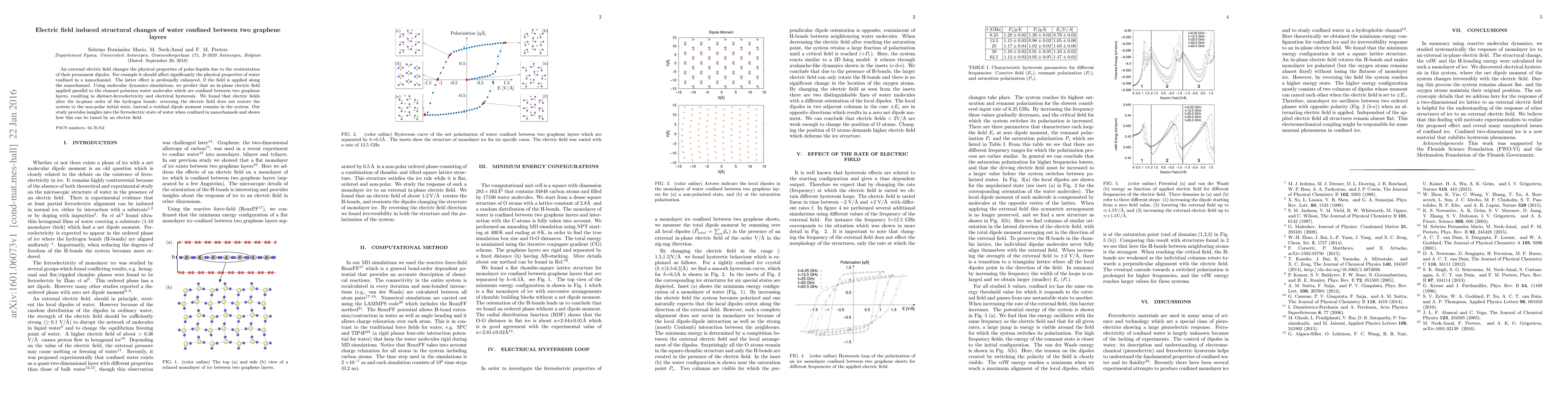 This study uses molecular dynamics simulations to show that an in-plane electric field applied to water confined between graphene layers induces distinct ferroelectricity and electrical hysteresis, altering the in-plane order of hydrogen bonds and leaving a residual dipole moment even after the field is reversed.