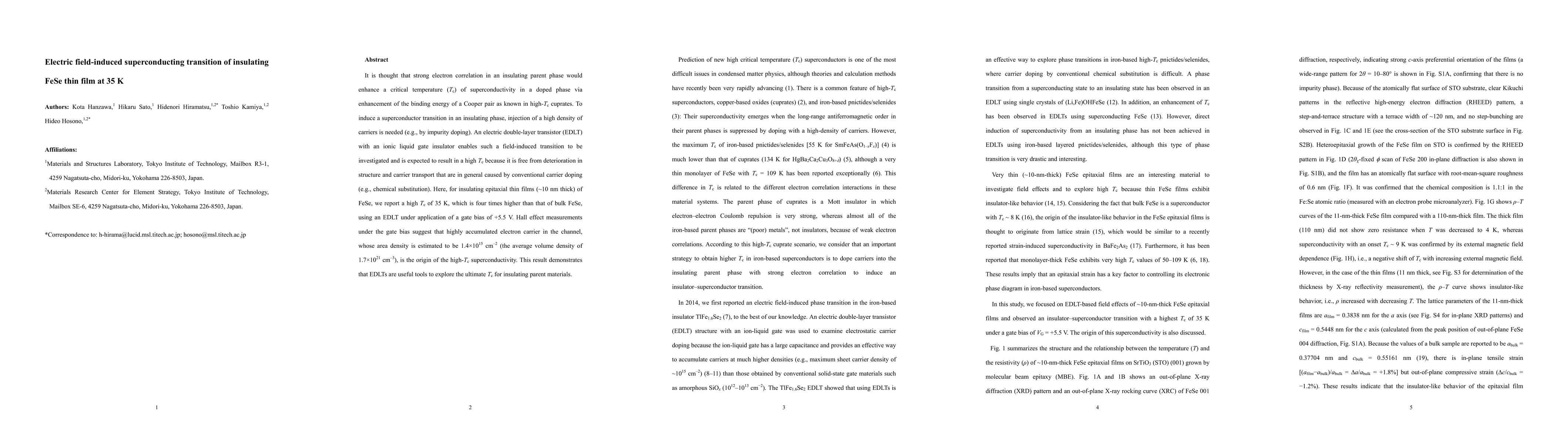 It is thought that strong electron correlation in an insulating parent phase would enhance a critical temperature (Tc) of superconductivity in a doped phase via enhancement of the binding energy of a Cooper pair as known in high-Tc cuprates. To induce a superconductor transition in an insulating phase, injection of a high density of carriers is needed (e.g., by impurity doping). An electric double-layer transistor (EDLT) with an ionic liquid gate insulator enables such a field-induced transition to be investigated and is expected to result in a high Tc because it is free from deterioration in structure and carrier transport that are in general caused by conventional carrier doping (e.g., chemical substitution). Here, for insulating epitaxial thin films (~10 nm thick) of FeSe, we report a high Tc of 35 K, which is four times higher than that of bulk FeSe, using an EDLT under application of a gate bias of +5.5 V. Hall effect measurements under the gate bias suggest that highly accumulated electron carrier in the channel, whose area density is estimated to be 1.4x10^15 cm-2 (the average volume density of 1.7x10^21 cm-3), is the origin of the high-Tc superconductivity. This result demonstrates that EDLTs are useful tools to explore the ultimate Tc for insulating parent materials.