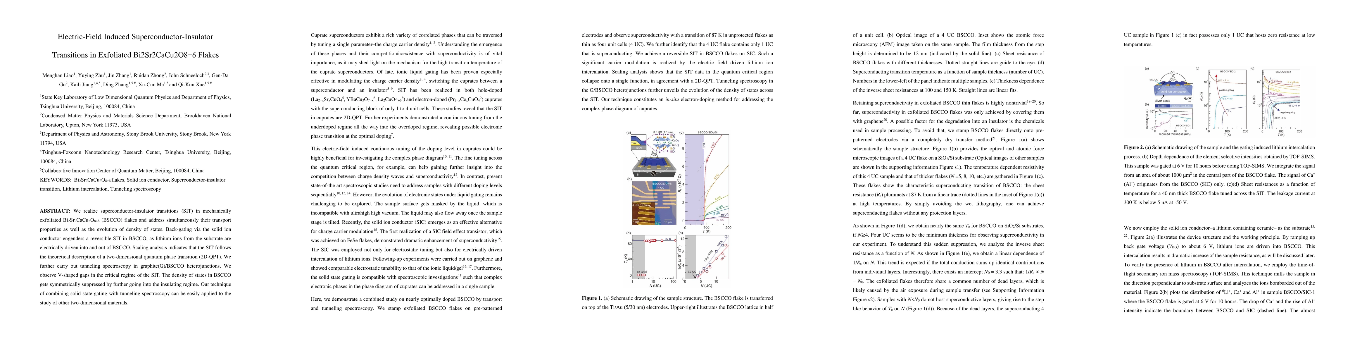 Researchers discovered a reversible superconductor-insulator transition in Bi$_2$Sr$_2$CaCu$_2$O$_{8+eta}$ flakes by controlling the electric field using solid-state gating, revealing V-shaped gaps in tunneling spectroscopy and symmetry in density of states.