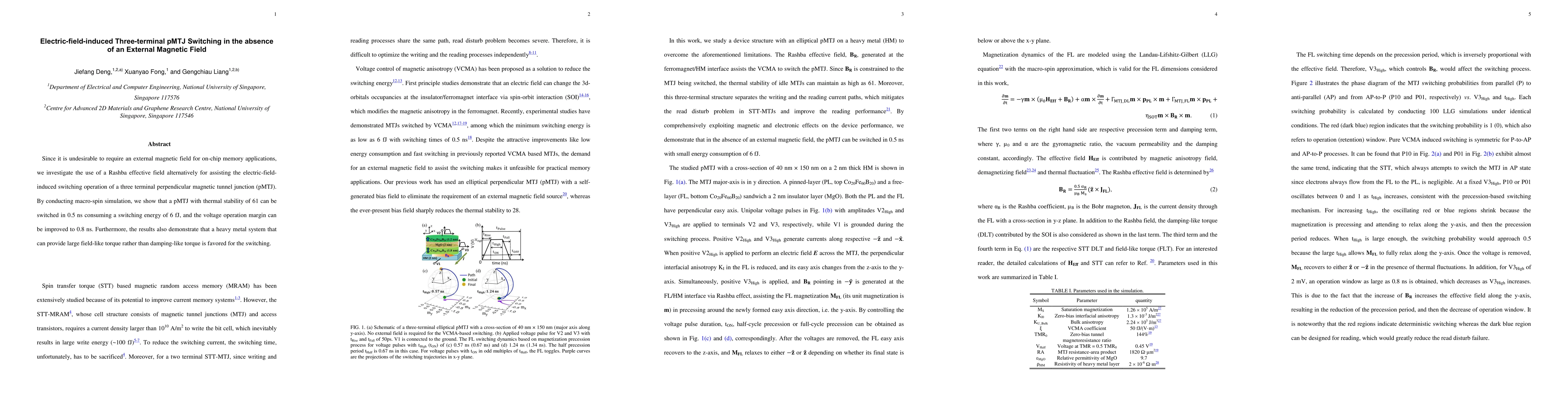 This paper explores electric-field-induced switching in a three-terminal perpendicular magnetic tunnel junction (pMTJ) without an external magnetic field, using a Rashba effective field. Simulation results show that the pMTJ can switch in 0.5 ns with a low energy consumption of 6 fJ, and a favorable voltage operation margin of 0.8 ns.