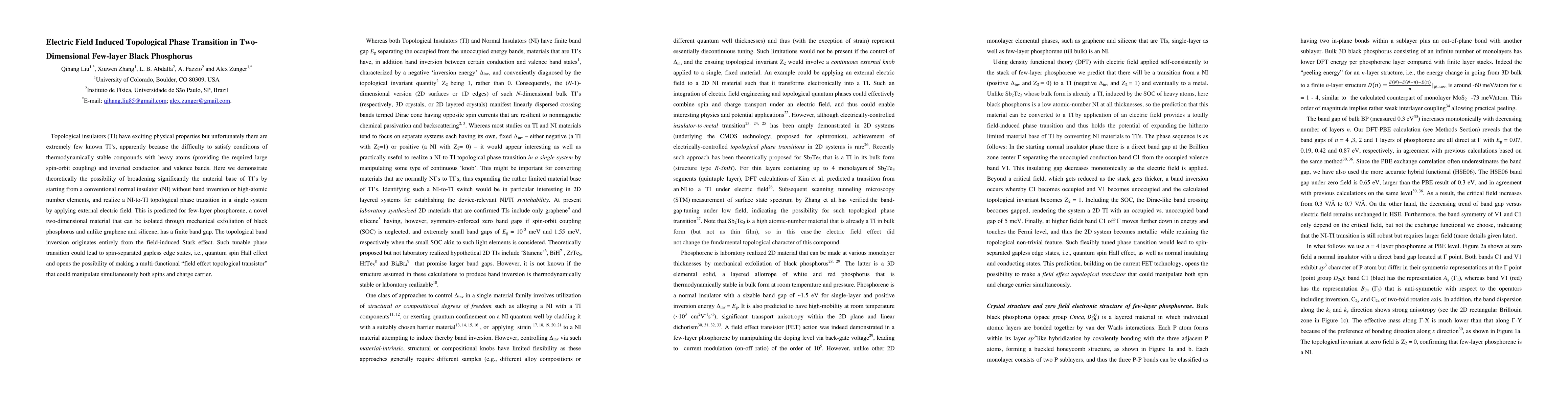 This paper reports on the electric field induced topological phase transition in few-layer black phosphorus (phosphorene), predicting a continuous transition from an insulator to a topological insulator and eventually to a metal under applied electric fields. This discovery enables the potential for creating multi-functional field effect topological transistors that can manipulate both spin and charge carriers.