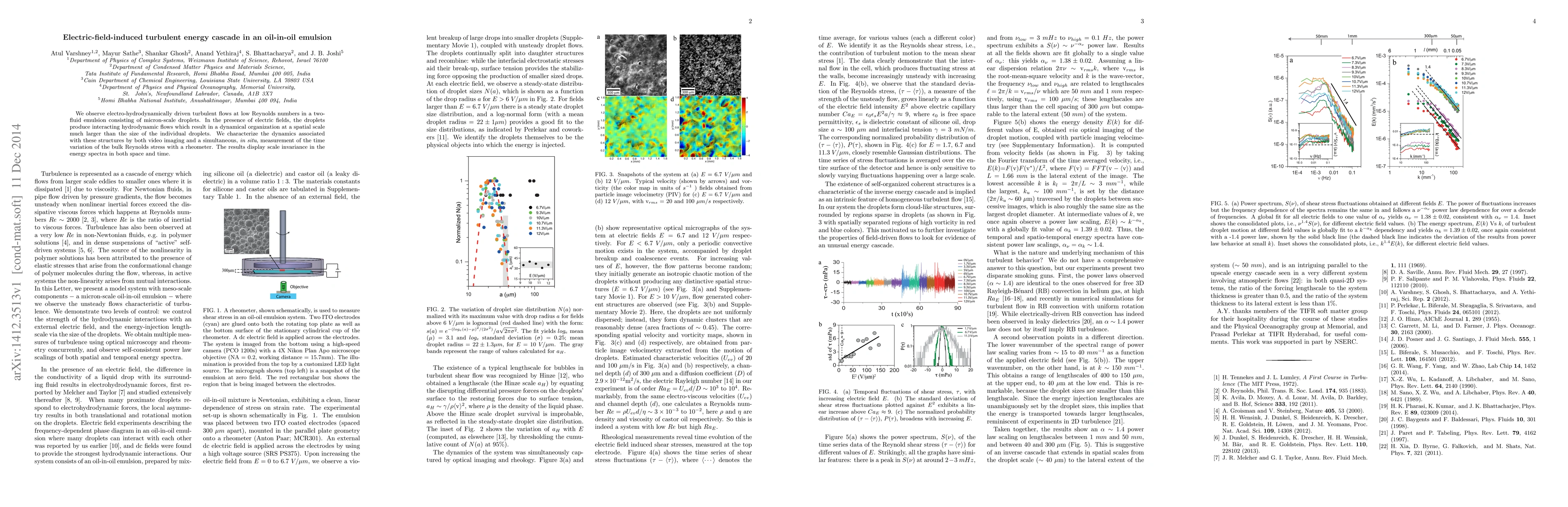 We observe electro-hydrodynamically driven turbulent flows at low Reynolds numbers in a two-fluid emulsion consisting of micron-scale droplets. In the presence of electric fields, the droplets produce interacting hydrodynamic flows which result in a dynamical organization at a spatial scale much larger than the size of the individual droplets. We characterize the dynamics associated with these structures by both video imaging and a simultaneous, in situ, measurement of the time variation of the bulk Reynolds stress with a rheometer. The results display scale invariance in the energy spectra in both space and time.
